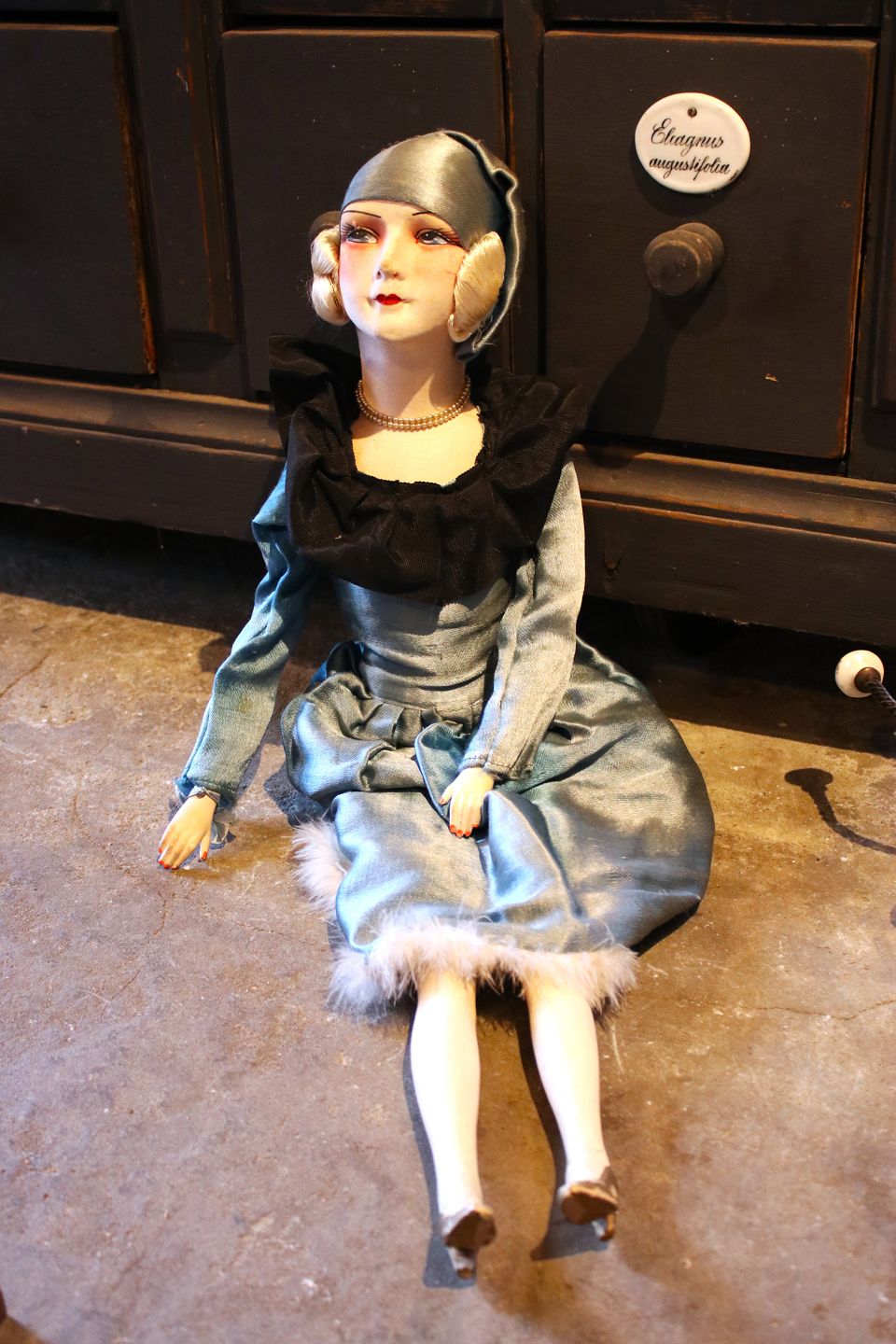 Gammel fransk vintage boudoir dukke i stof med silkekjole.