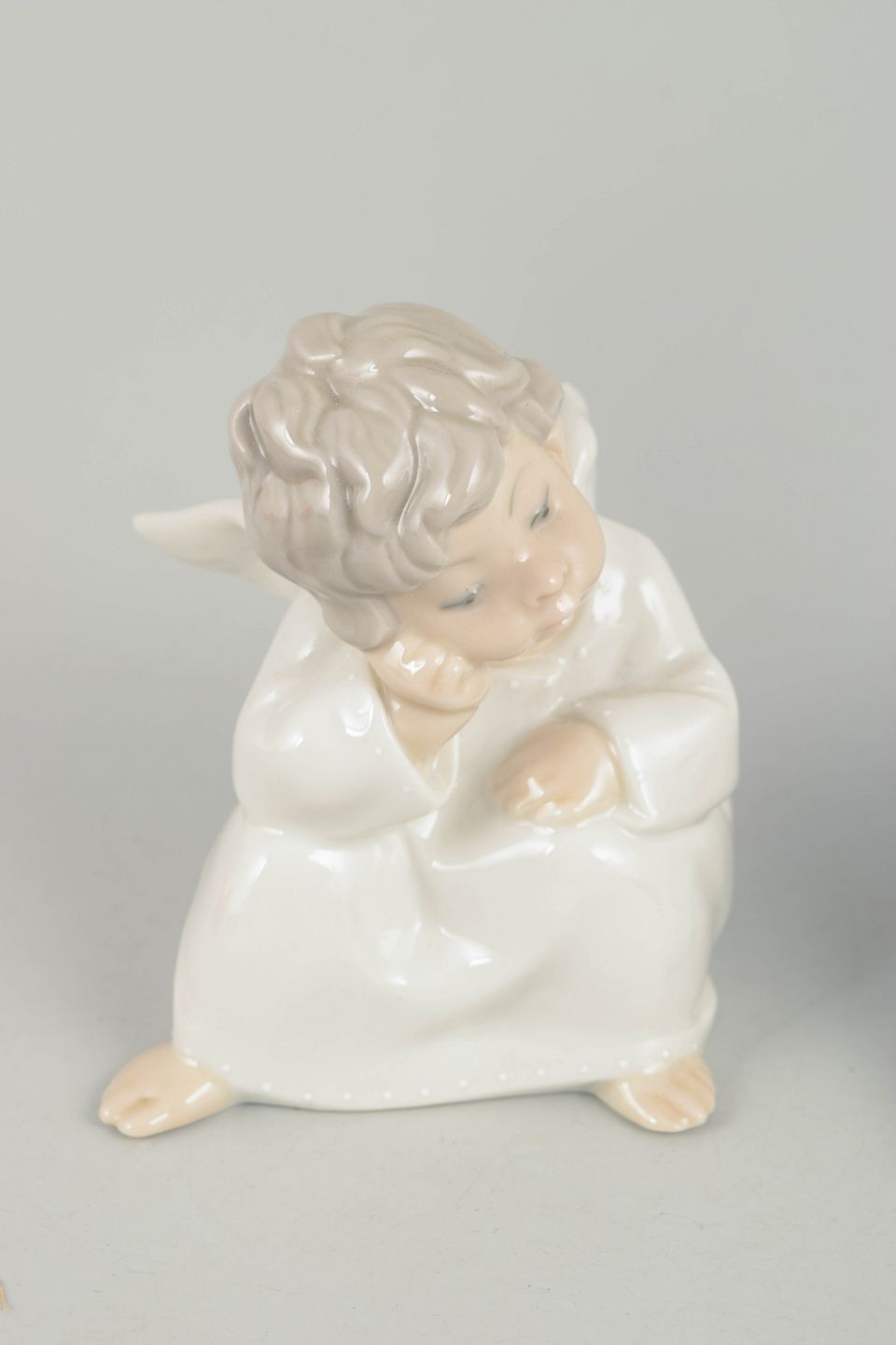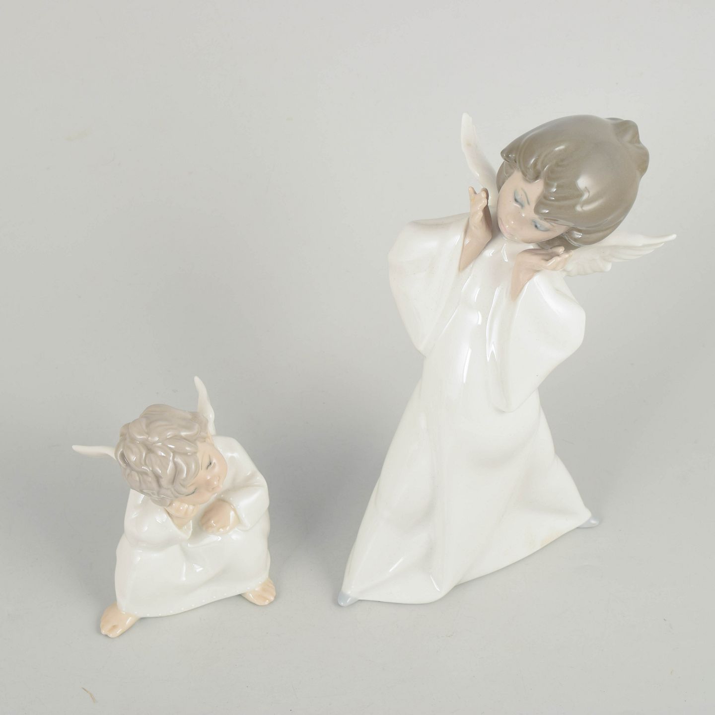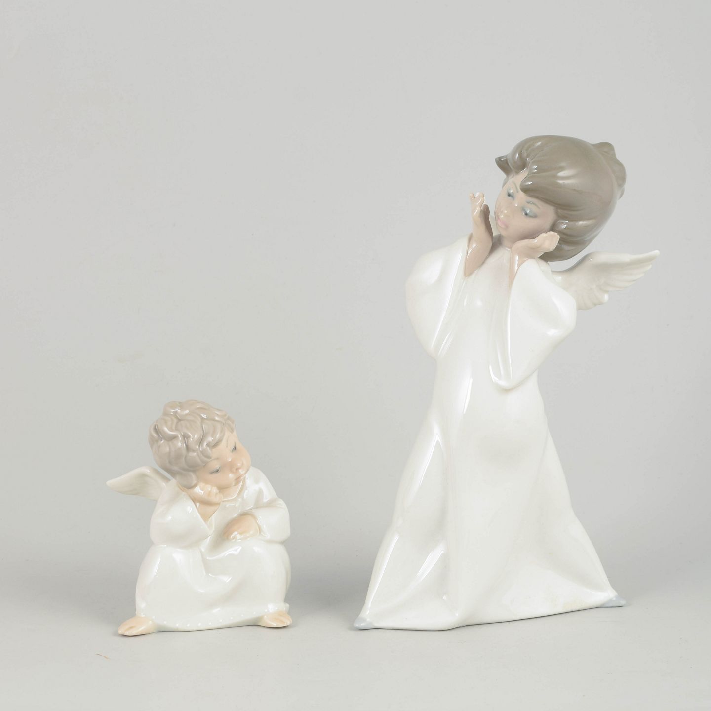 To fine porcelænsfigurer forestillende engle i klassisk Lladró stil med bløde former og afdæmpede farver. Den ene stående og den anden siddende, begge med detaljeret modellering og karakteristisk glasur.