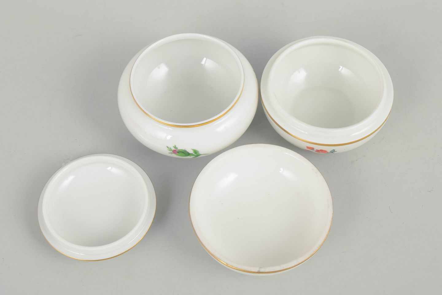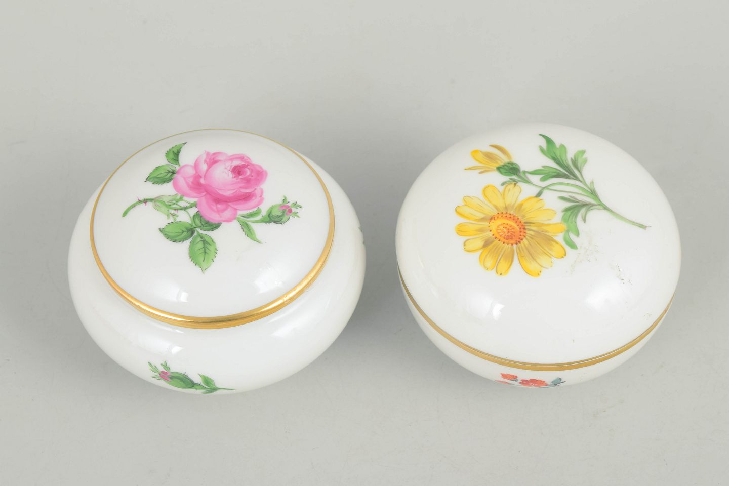Sæt af to lågkrukker i porcelæn håndmalet med polykrome blomster og dekoreret med guldkant. Klassiske Meissen former fra midten af det 20. århundrede med fint tilpassede låg og elegant afrundet profil. Begge mærket med Meissen krydssværd.