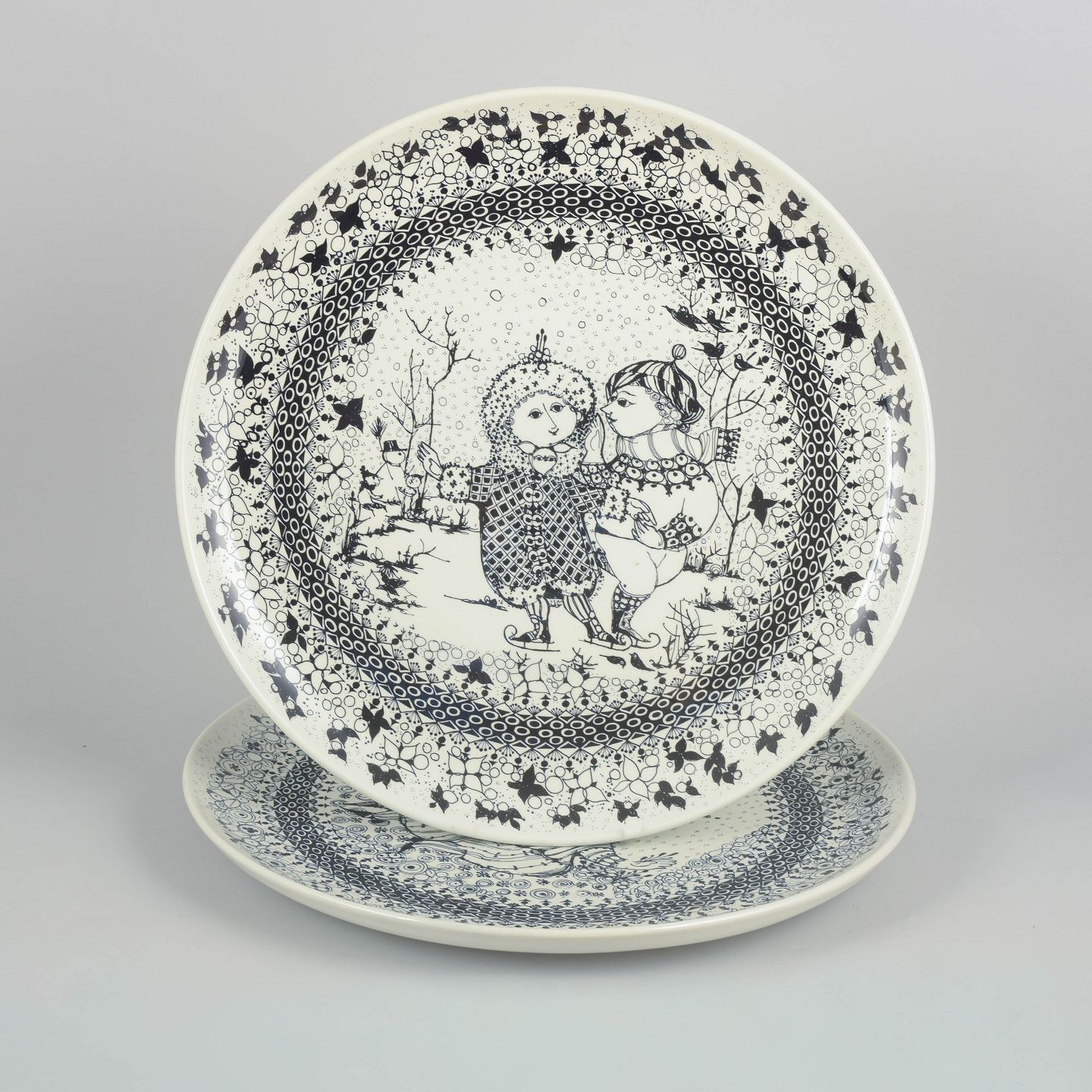 Dekorative runde fade i fajance med sort stregdekoration i Bjørn Wiinblads karakteristiske eventyrlige stil, med figurmotiver og ornamentale borter. Motiverne repræsenterer årstiderne vinter og forår.