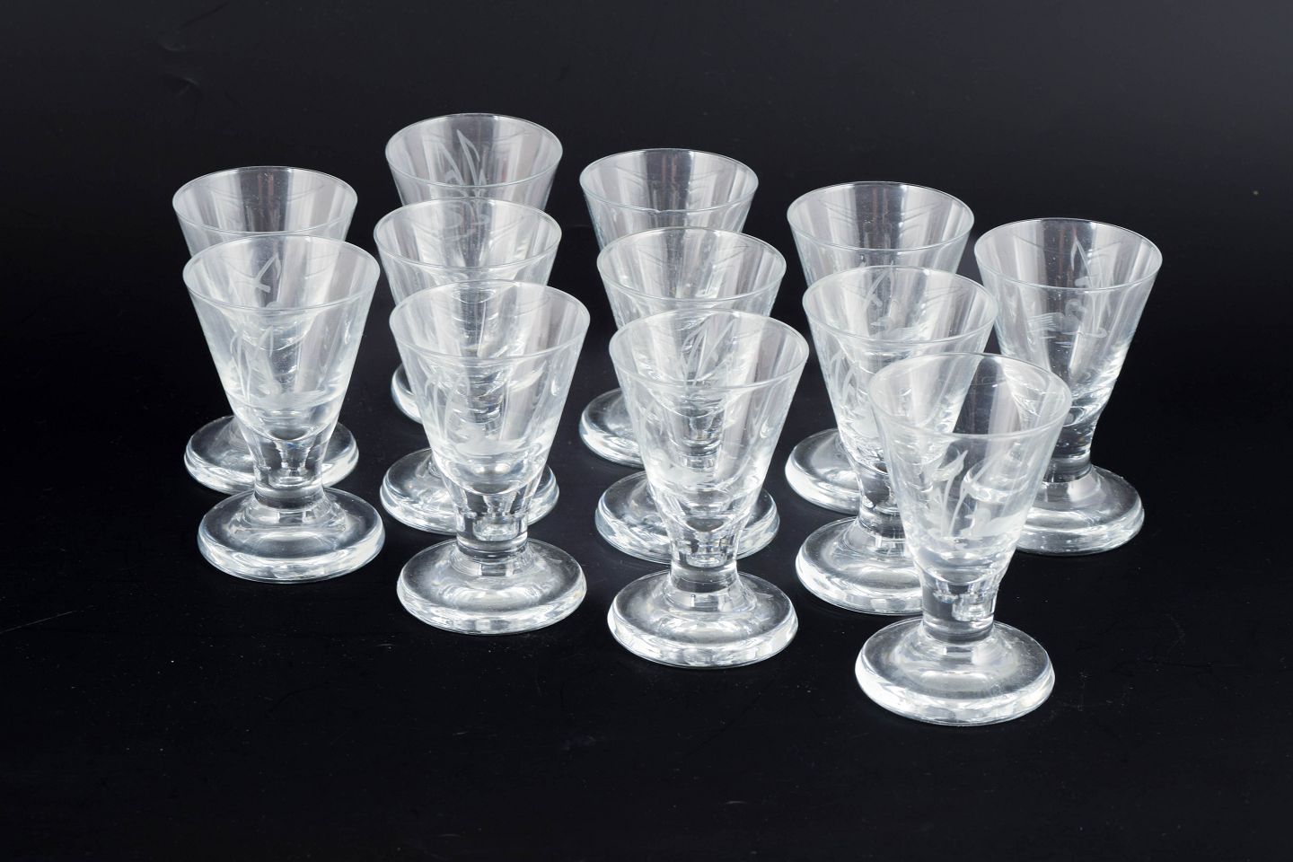 Skandinavisk glasværk, sæt af tolv snaps glas med ande- og sivmotiv.