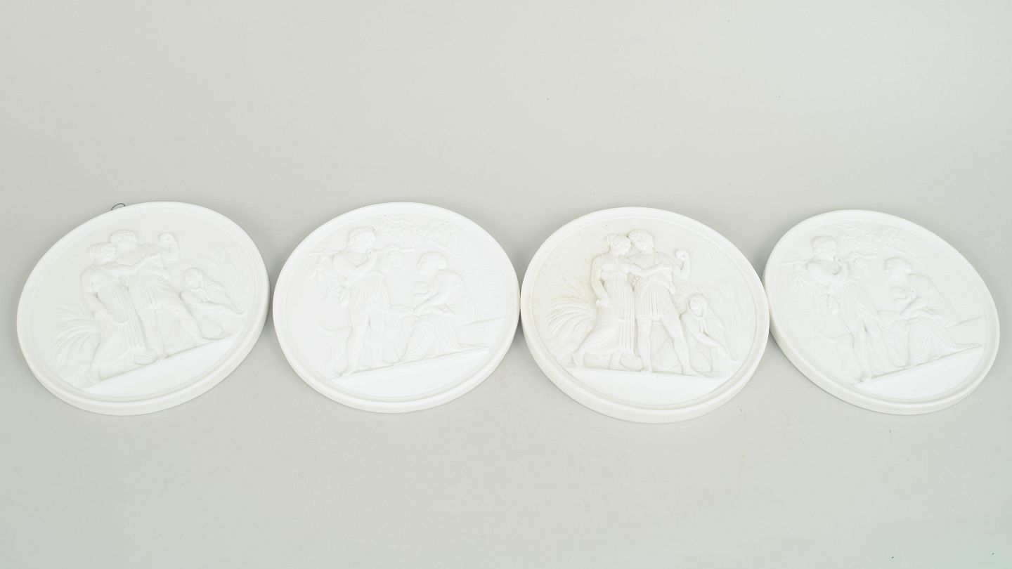 Relieffer i hvidt uglaseret porcelæn med klassiske motiver efter Bertel Thorvaldsen, udført i fin biscuit med detaljeret figurdekoration og ophæng på bagsiden. Første sortering.