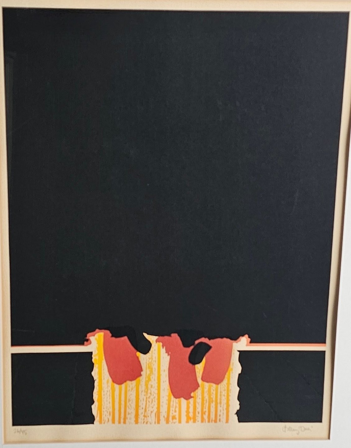 Litografi med abstrakt motiv og røde og gule nuancer monteret i metal ramme