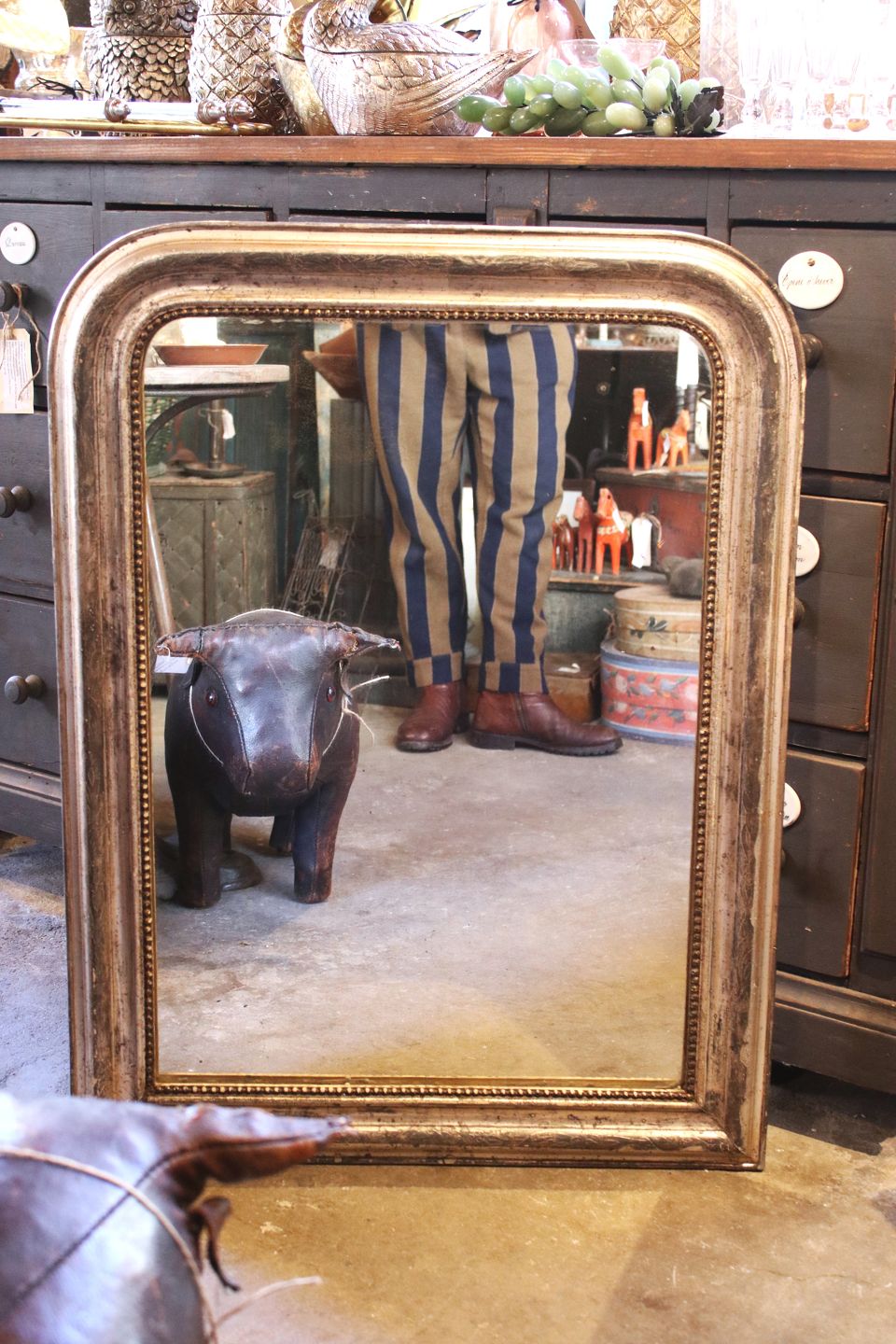 Fransk 1800 tals Louis Philippe sølv kamin spejl med fin dekoreret ramme med perlekant og originalt gammelt spejlglas med en super fin patina. Mål: H:86,5cm. B:65cm.