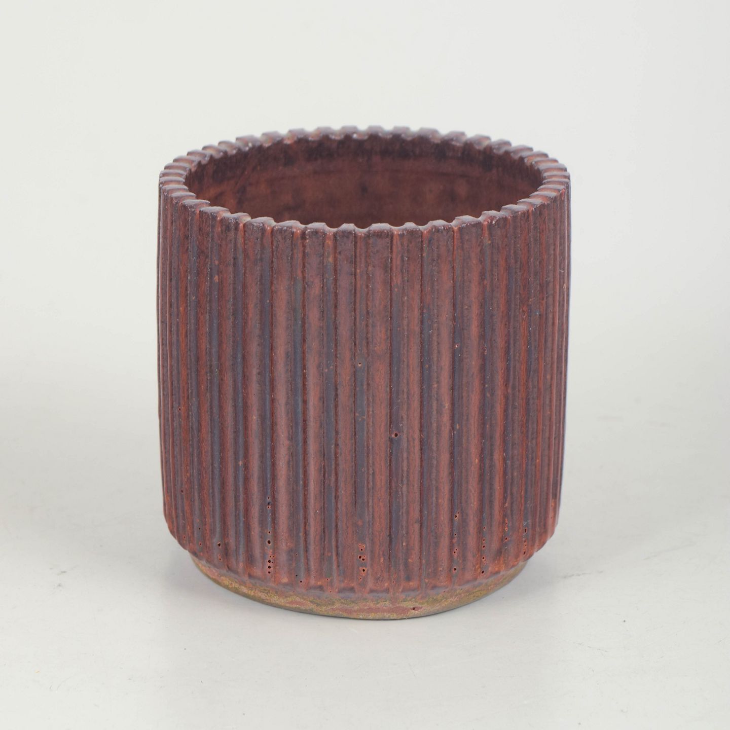 Cylindrisk vase i stentøj med lodrette riller og dyb brunviolet glasur med varme nuancer.