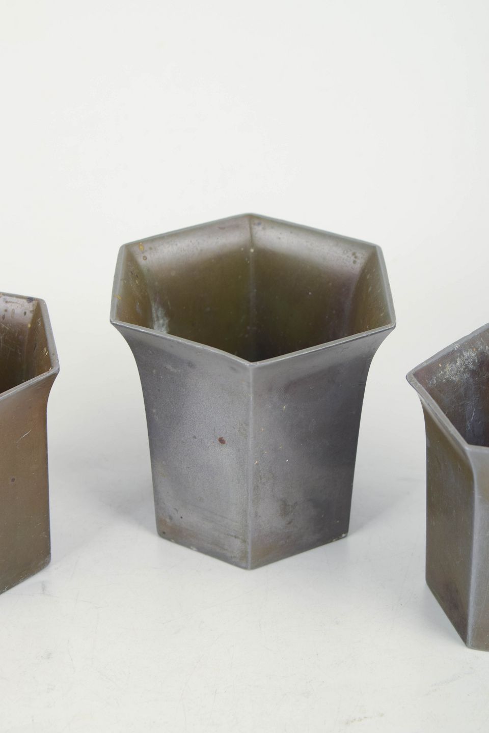 Tre små vaser i diskometal med sekskantet korpus og stilrent art deco formsprog. Modeller D22 og D23.