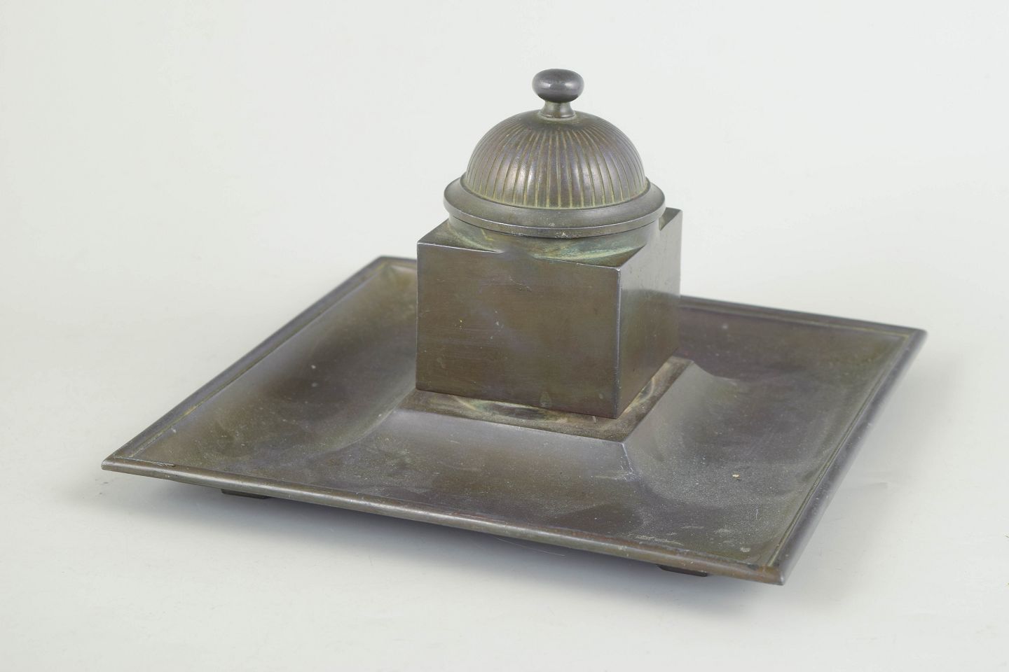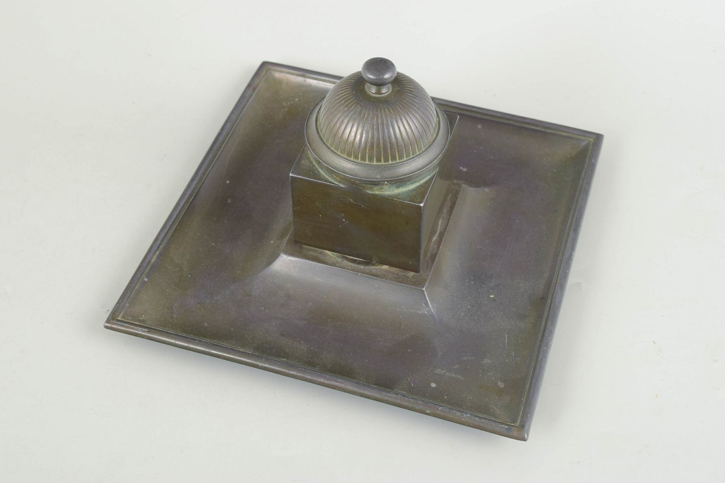 Blækhus i diskometal med kvadratisk bakke og original glasindsats, toppet med riflet låg i klassisk art deco formsprog.