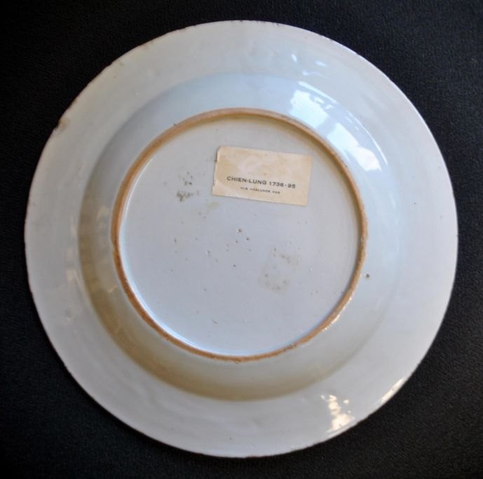 Kinesisk blå/hvid tallerken, 18. årh. Chien-Lung. Håndmalede dekorationer af blomster og insekter. Dia.: 23,5 cm.