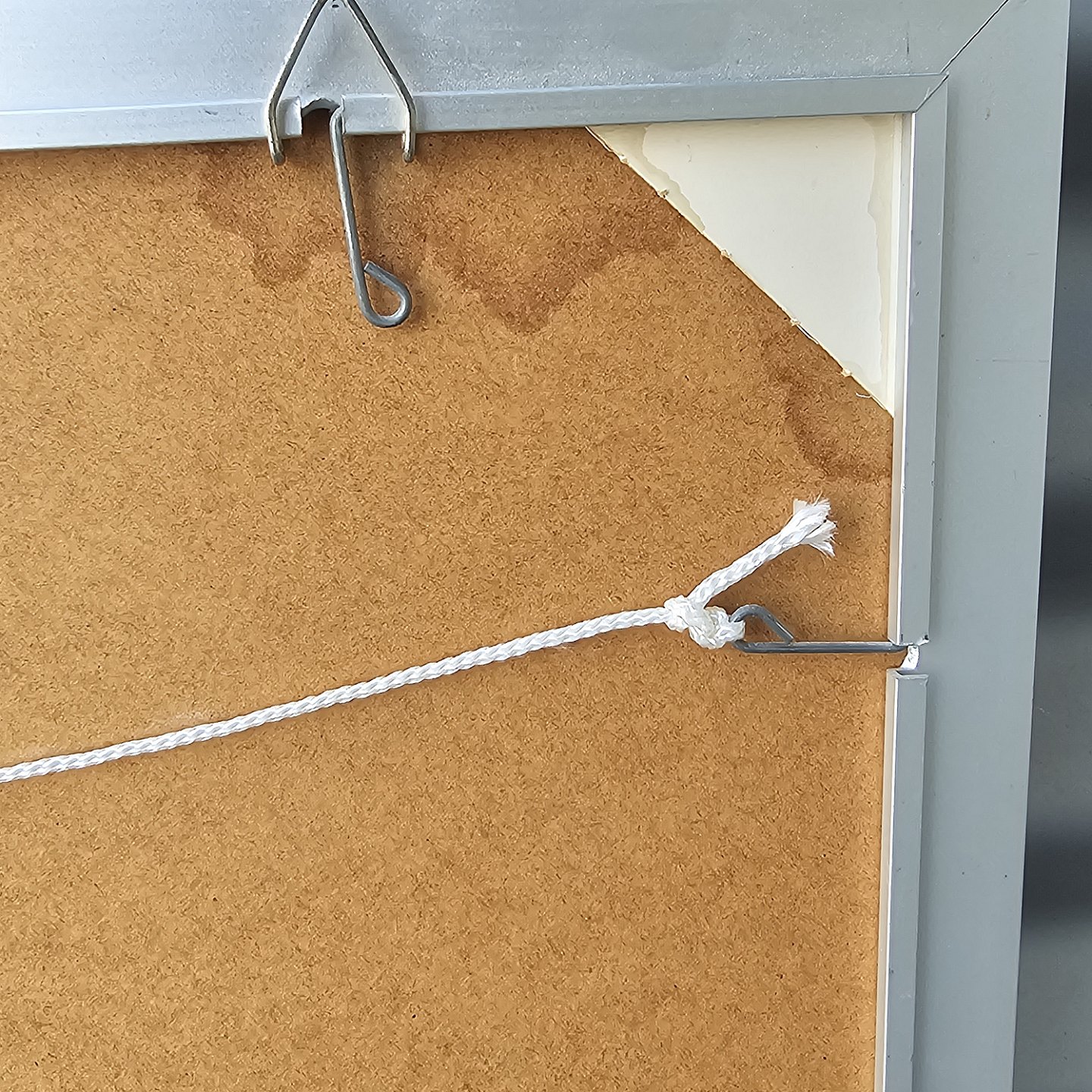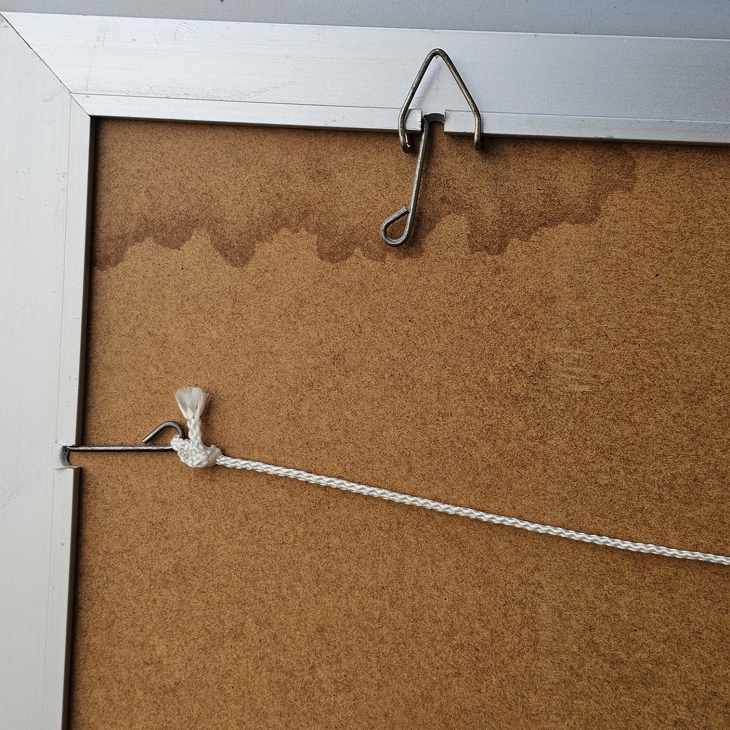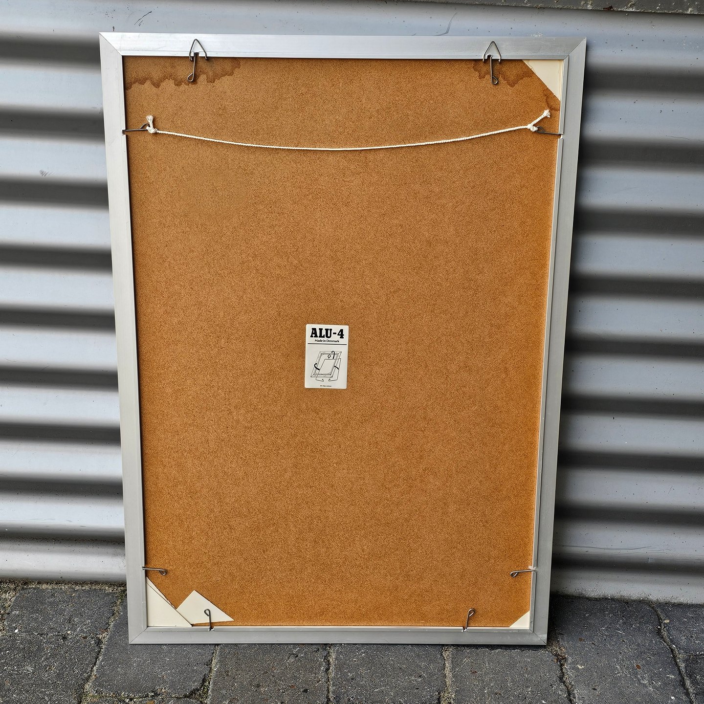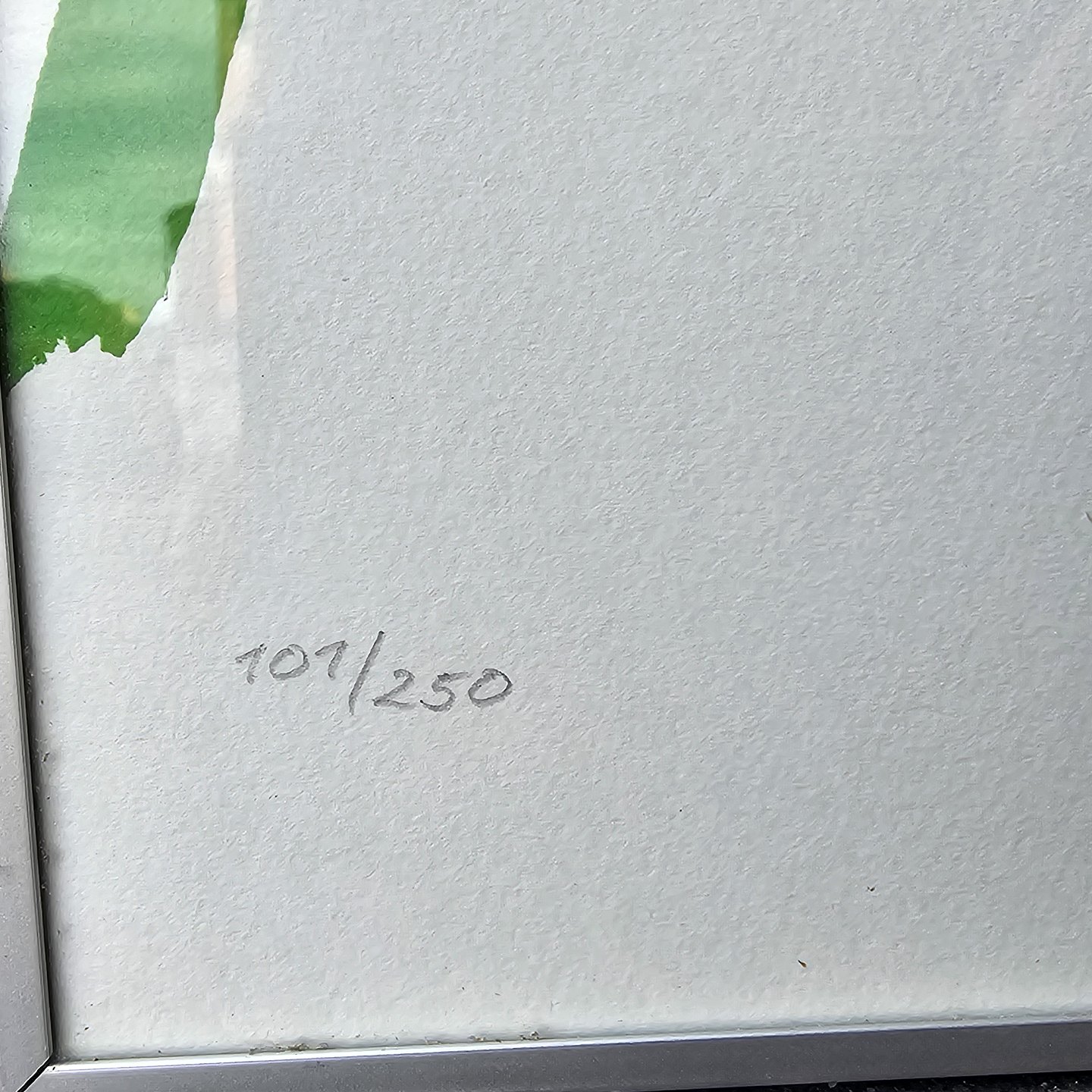 Litografi med motiv af lyserøde blomster monteret i metal ramme