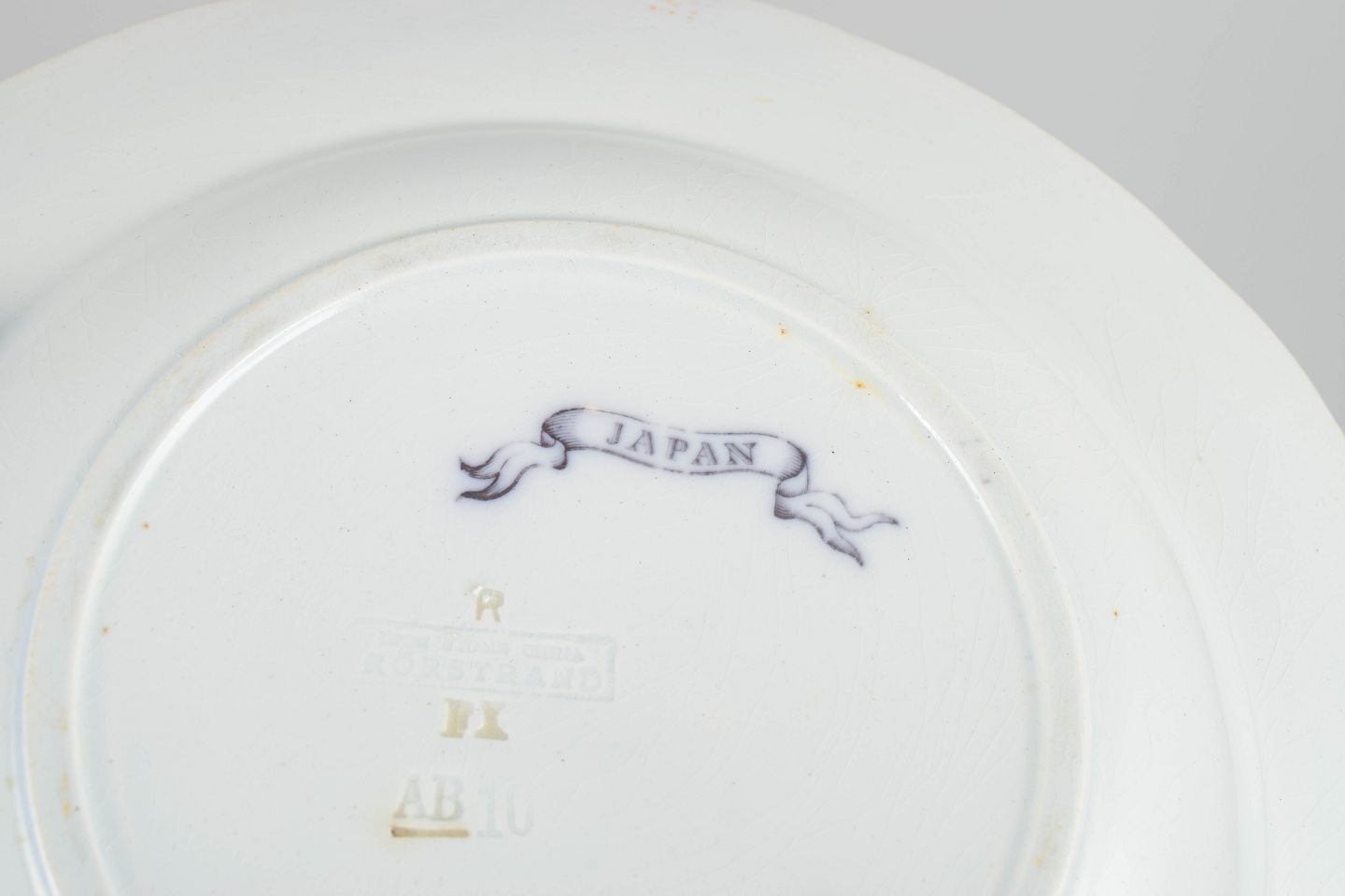 Dybe tallerkener i fajance med orientalsk inspireret dekoration i polykrome farver og detaljerig bemaling i japansk stil, karakteristisk for Rörstrands japanismeproduktion fra begyndelsen af 1900-tallet.