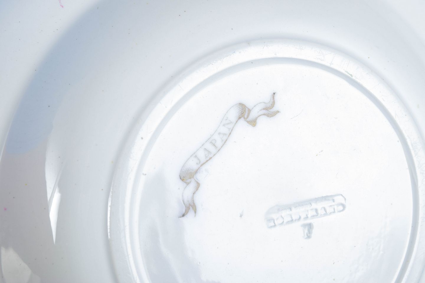 Dybe tallerkener i fajance med orientalsk inspireret dekoration i polykrome farver og detaljerig bemaling i japansk stil, karakteristisk for Rörstrands japanismeproduktion fra begyndelsen af 1900-tallet.