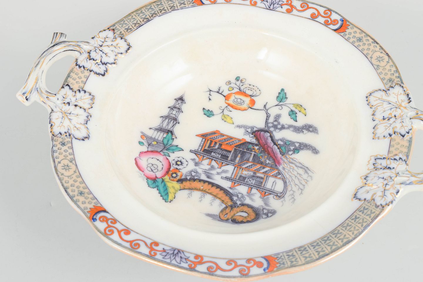 Terrin i fajance med orientalsk inspireret dekoration i polykrome farver og detaljerig bemaling i japansk stil, karakteristisk for Rörstrands japanismeproduktion fra begyndelsen af 1900-tallet.
