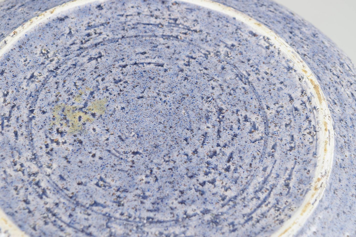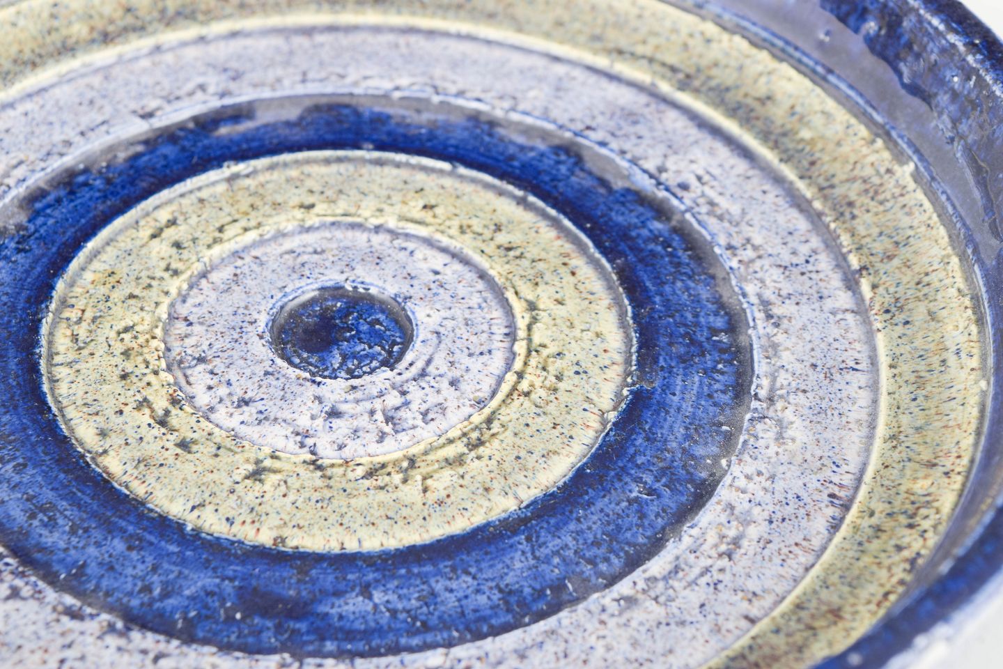 Håndlavet rundt fad i keramik med koncentriske ringe og karakteristisk glasur i blå, creme og sandfarvede nuancer. Udført i 1970’erne i Bitossis velkendte kunstneriske stil.