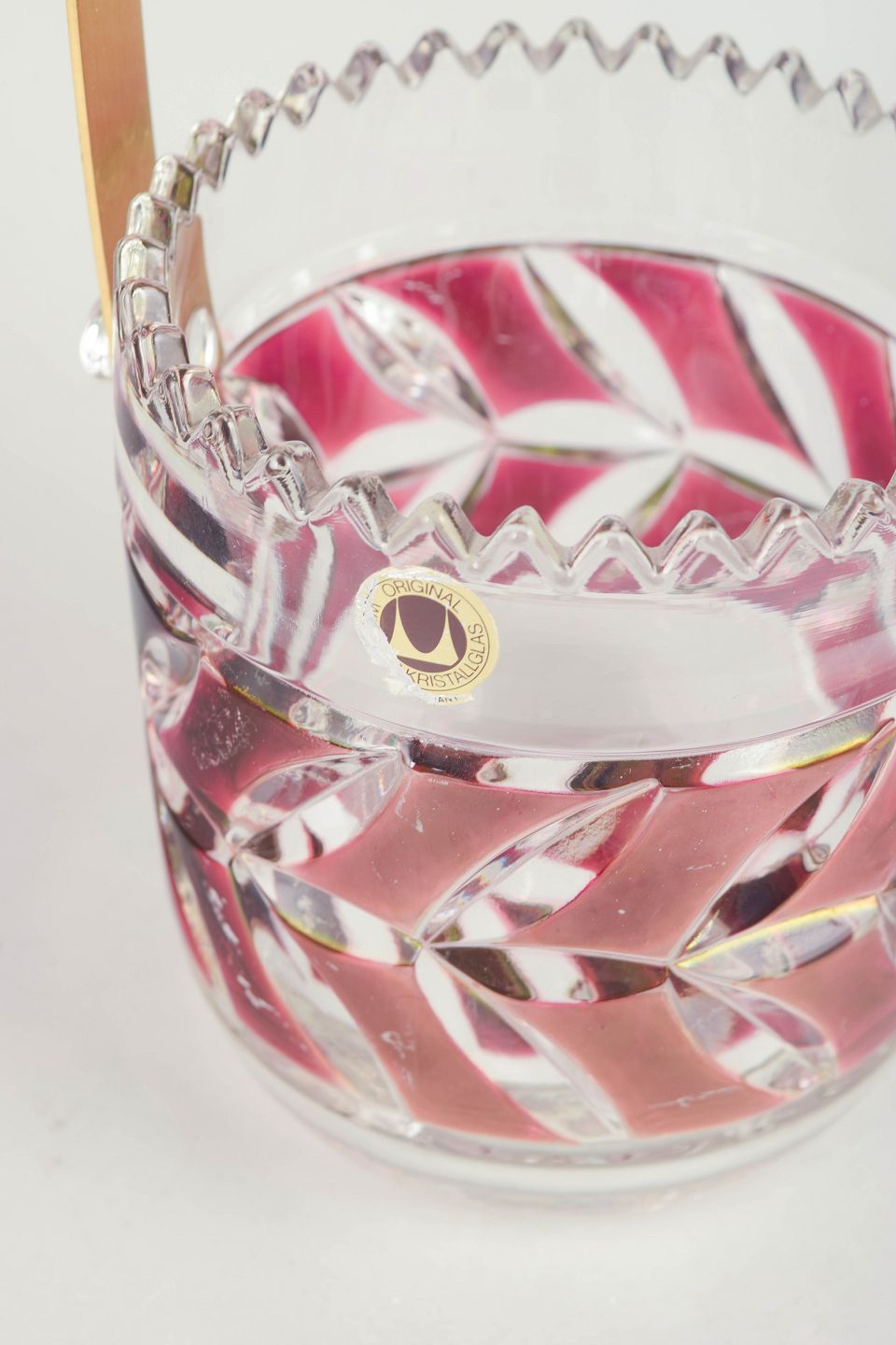 Presset og slebet krystal i klart og rosa tonet glas med geometrisk slebet mønster, med håndtag i messing og original mærkat.