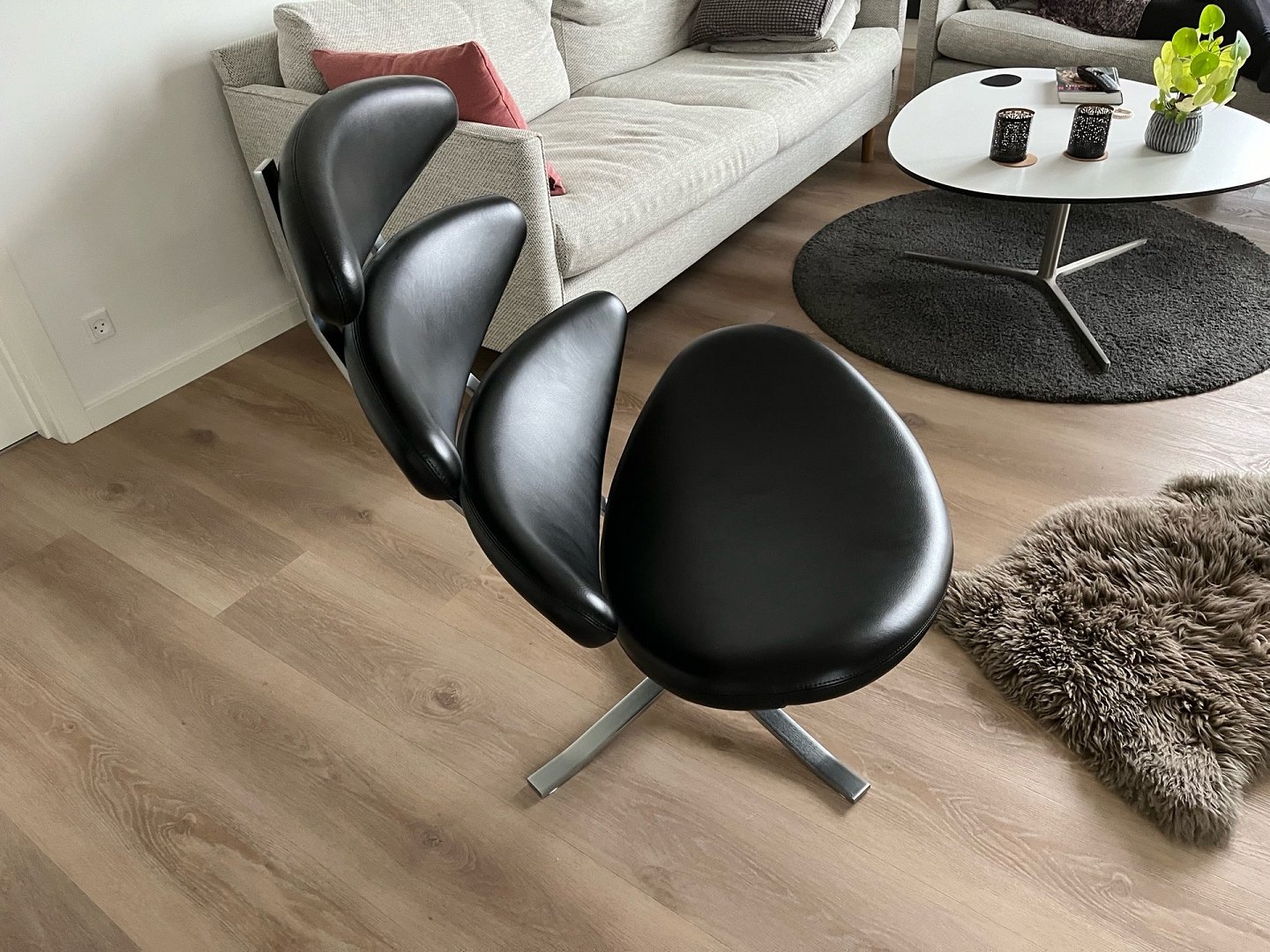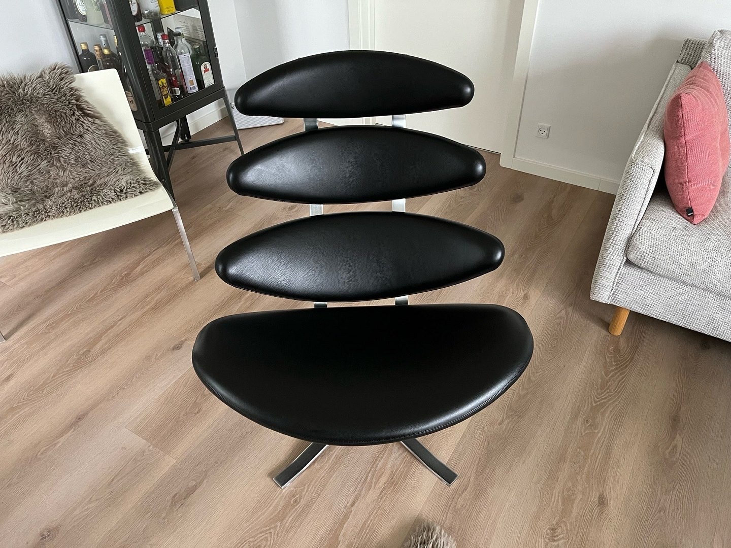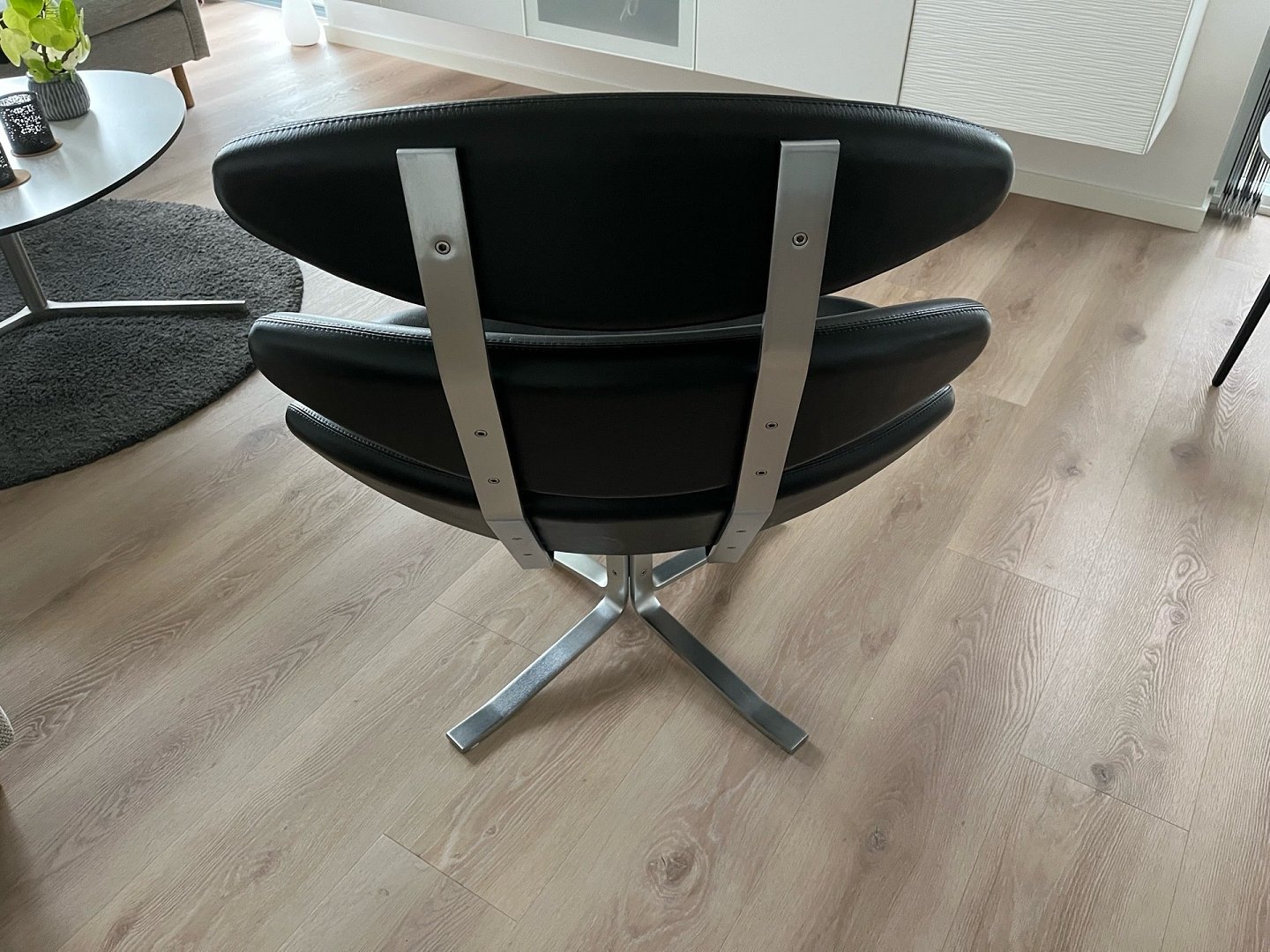 Elegant og ikonisk Corona stol udført i sort Omni 301 semianilinlæder med stel i matforkromet fjederstål. Oprindelig nypris: kr. 42.840.