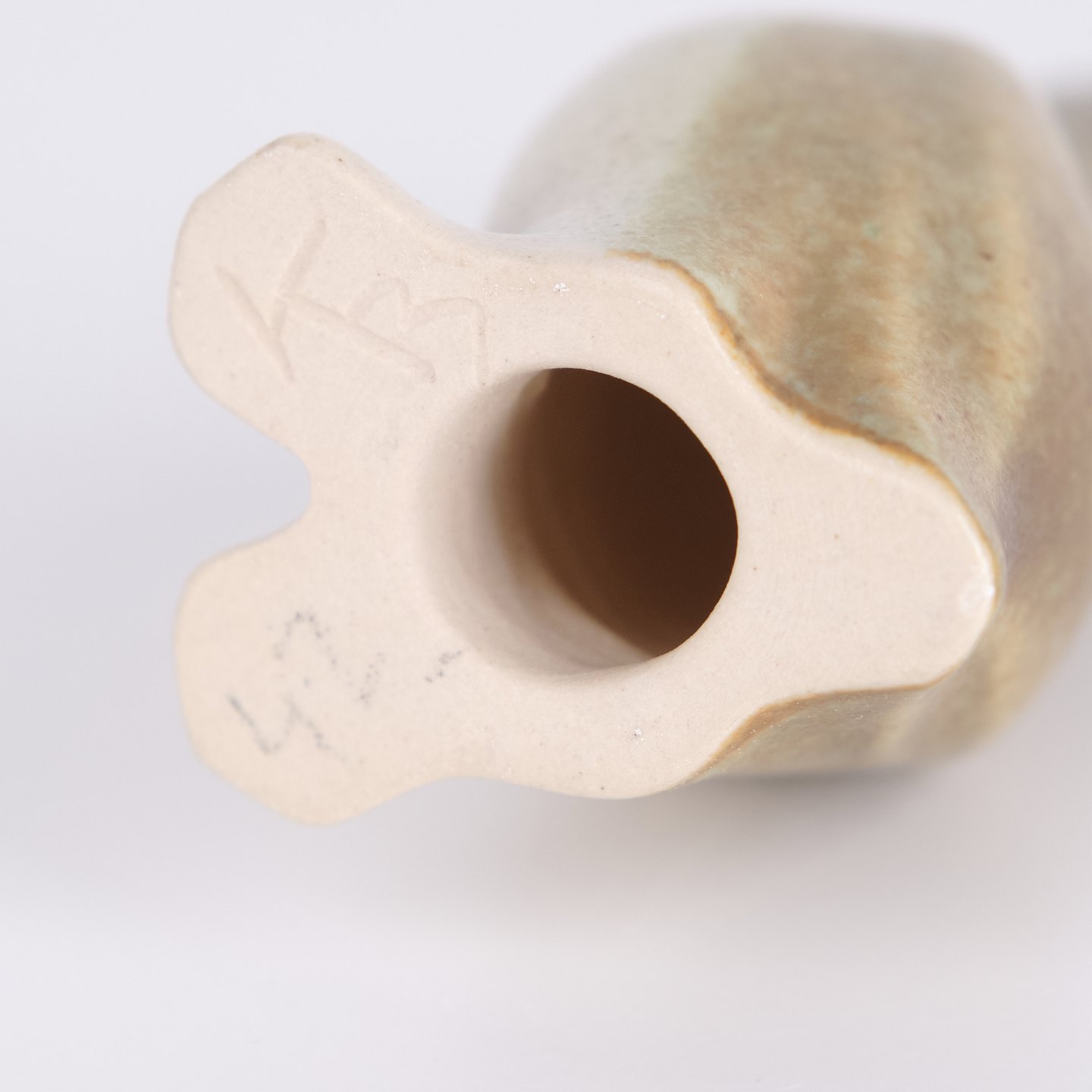 Keramisk pingvinfigur udført i glaseret stentøj fra 1960’erne. Figuren har enkel skandinavisk form med lyse glasurer og brun dekoration.