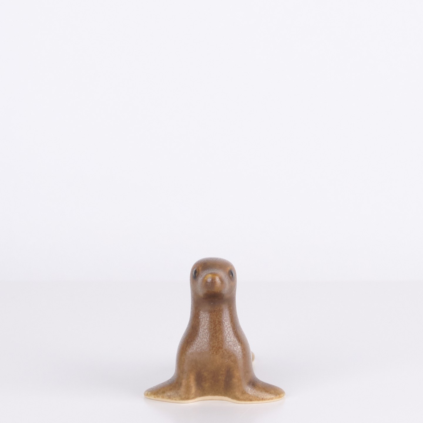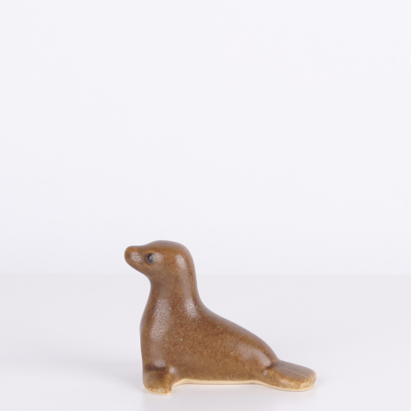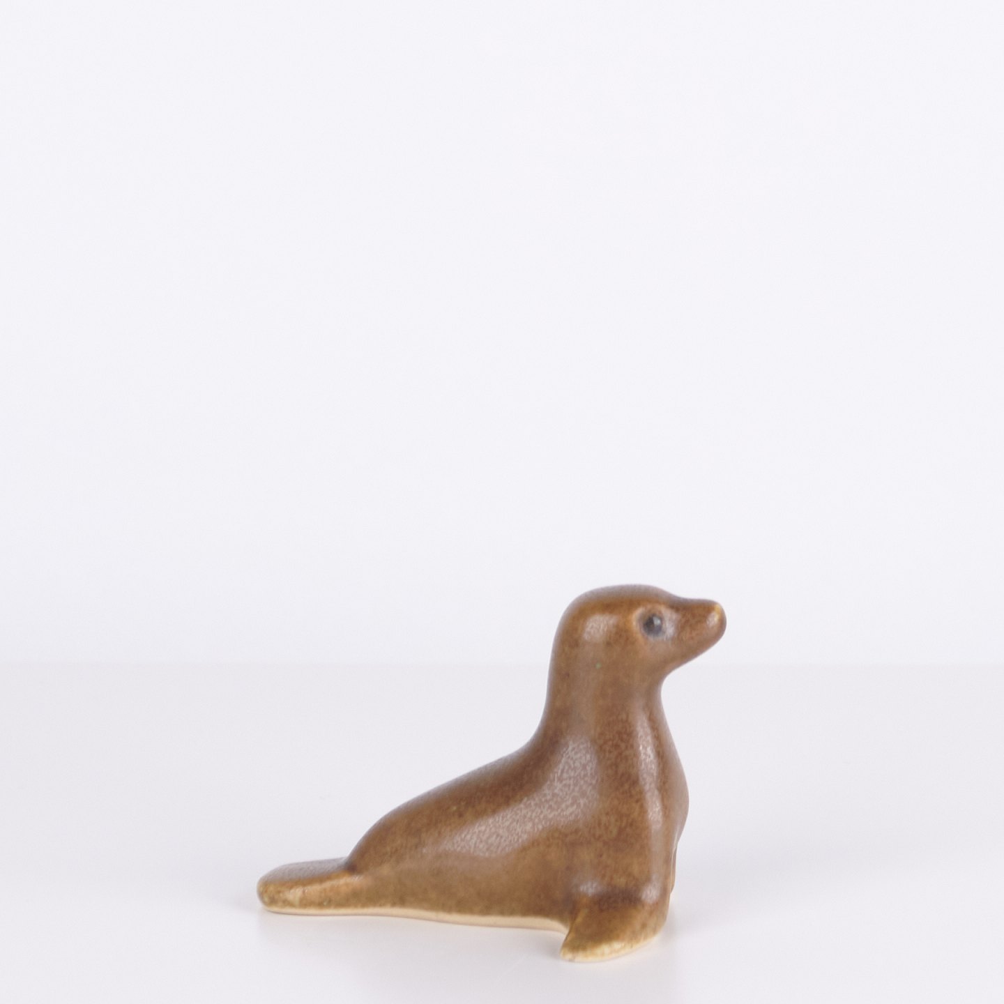 Sælfigur af Knud Basse udført i glaseret keramik. Figuren er fremstillet i Danmark i 1960’erne. Knud Basse er kendt for keramiske dyrefigurer med naturmotiver produceret i perioden.