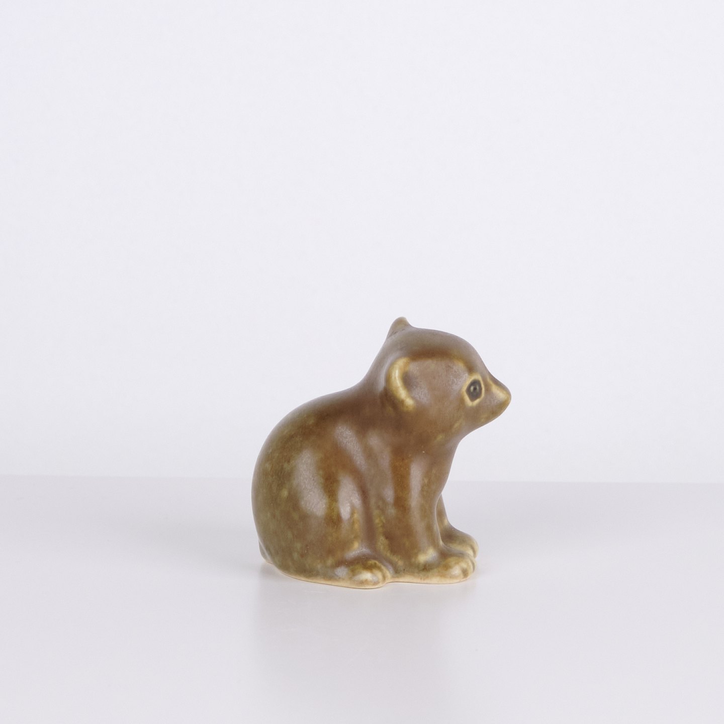 Kattefigur af Knud Basse udført i brun glaseret keramik. Modellen viser siddende kat med fremhævede øjne og afrundet kropsform.