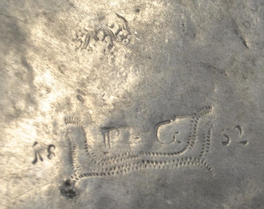 Tinfad, 18. årh. Med stempler og graveringer. Foran indgravering: PH.M og blomsterdekor. På undersiden: P. G 1832. Utydelige mesterstempler. Dia: 29 cm.