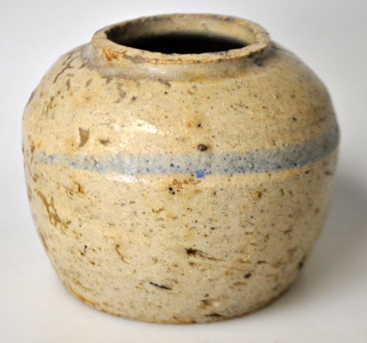 Antik kinesisk ingefær krukke i stentøj, 18./19. årh. Med blå dekoreret stribe. H.: 8 cm.