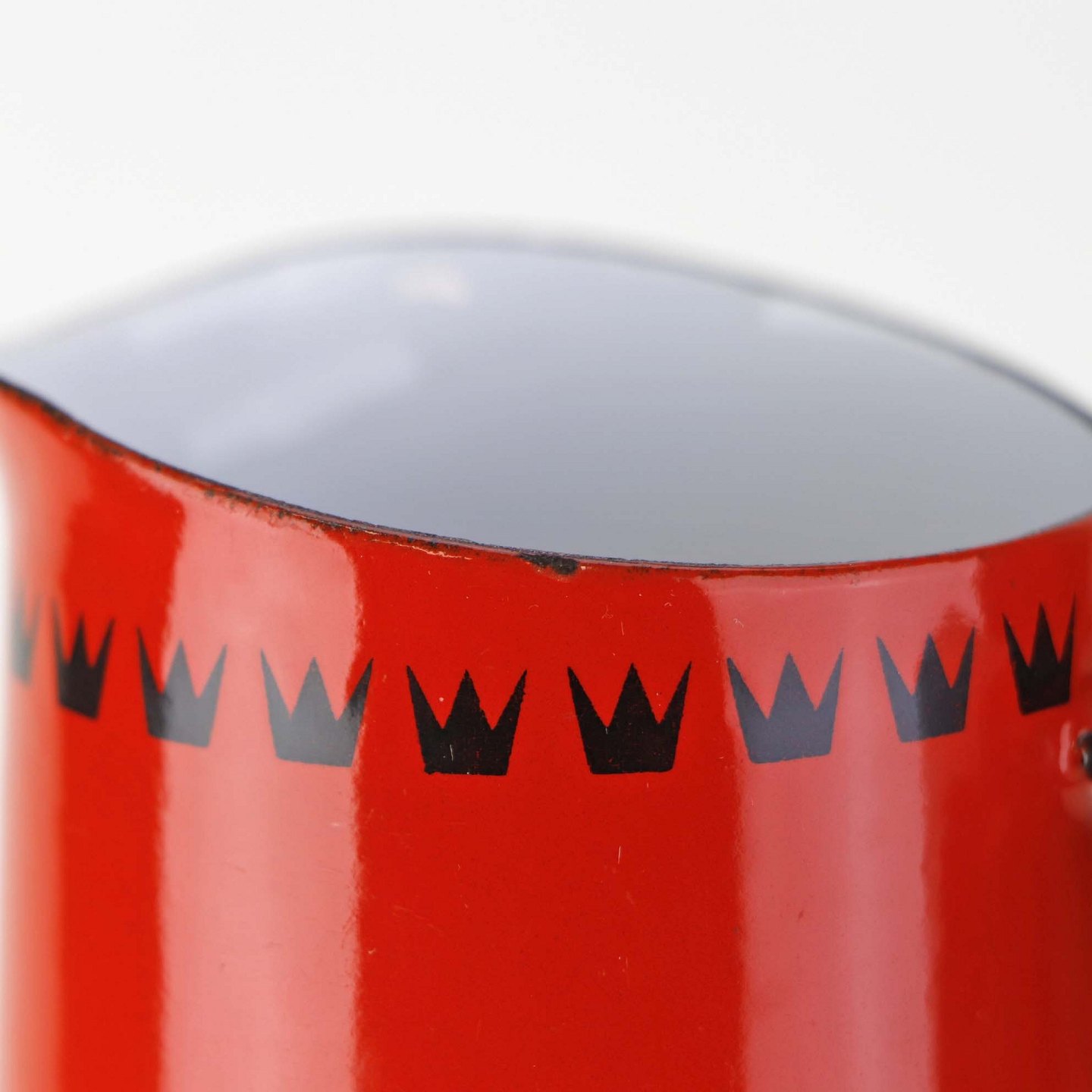 Dankok kande i metal belagt med rød, hvid og sort emalje og mønster af sorter tretakket kroner. Del af hanken er omgivet af sort plast.