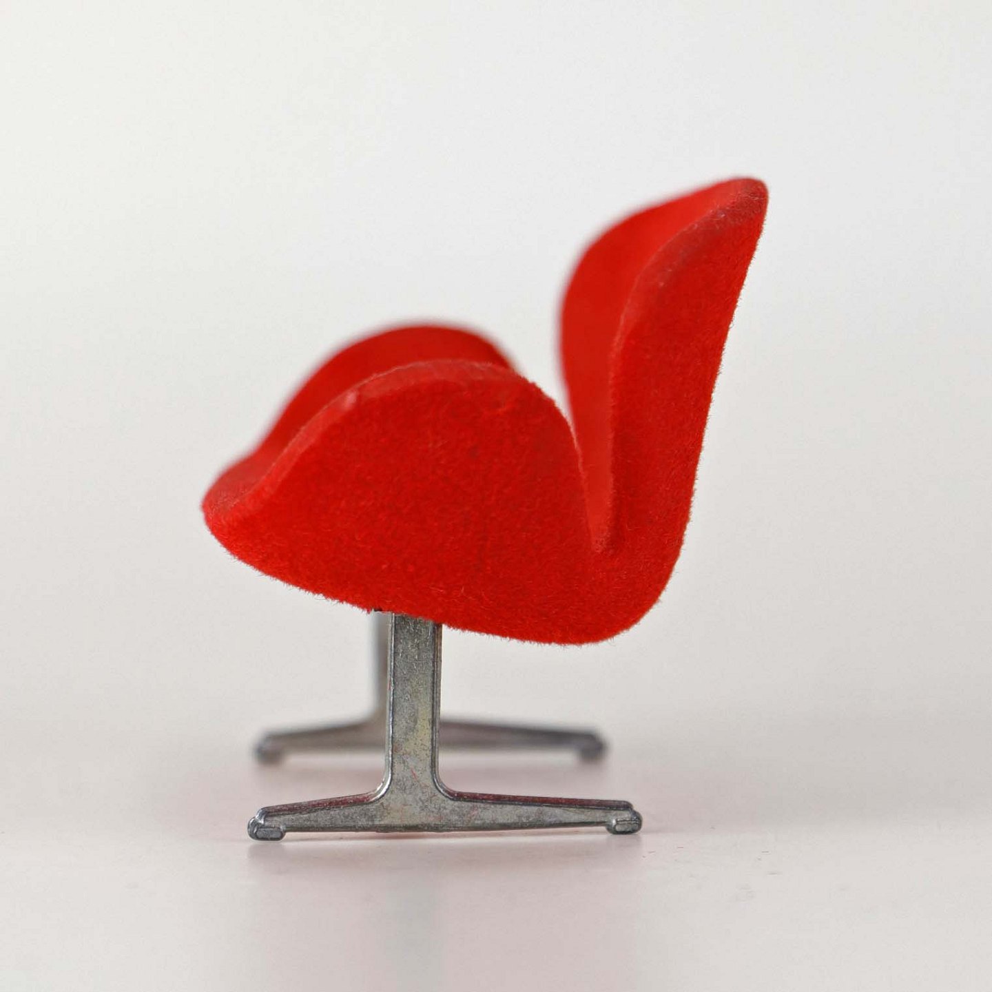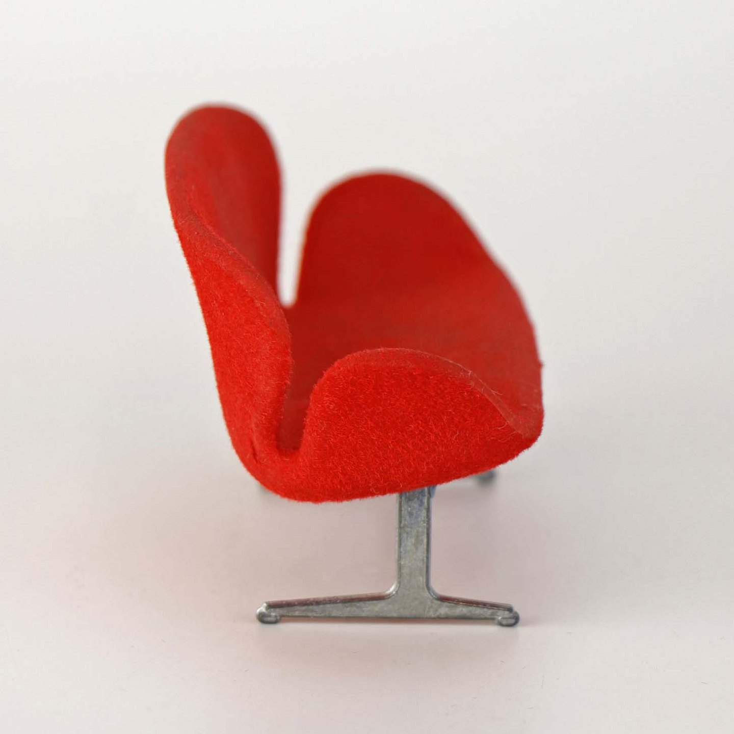 Miniature designermøbel til dukkehus med model af Arne Jacobsen's Svanesofa i rød farve med stel i metal.