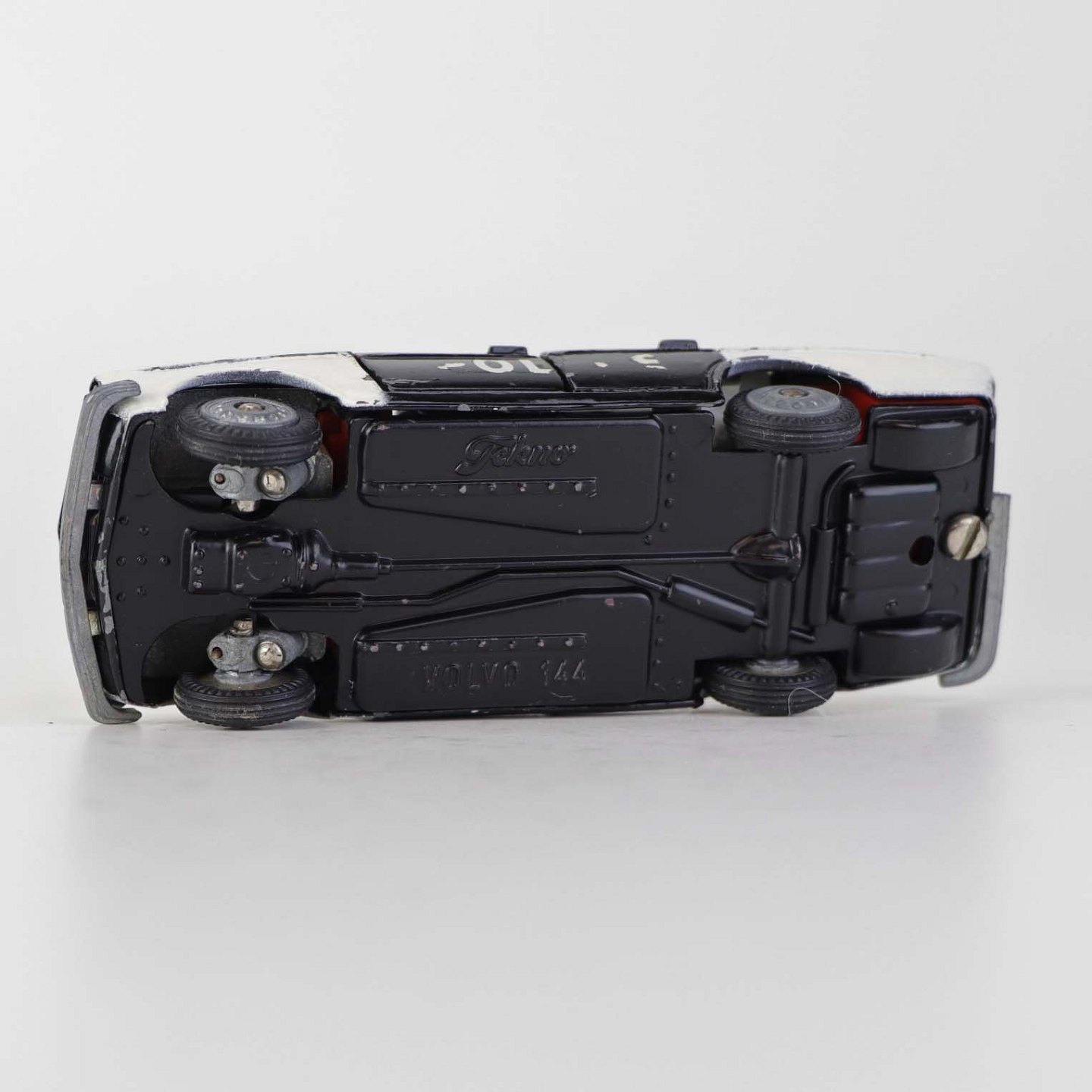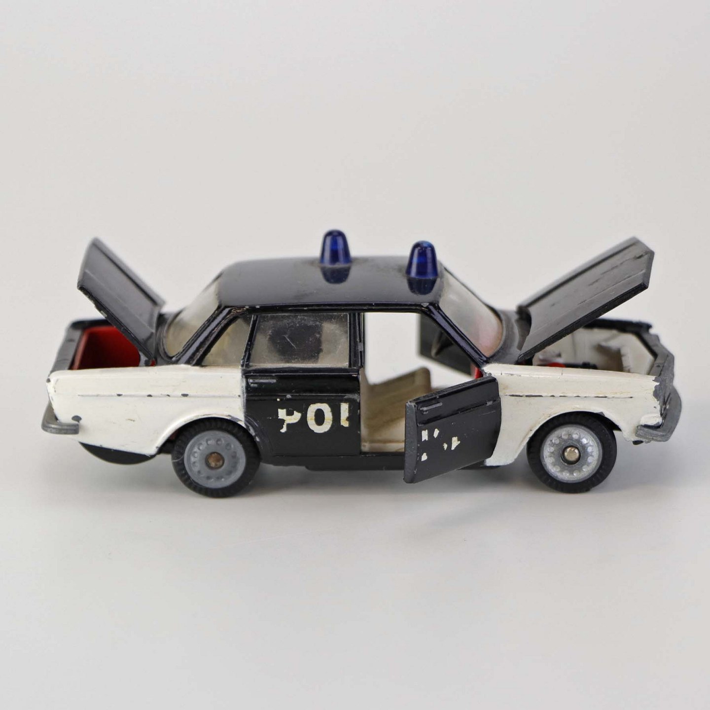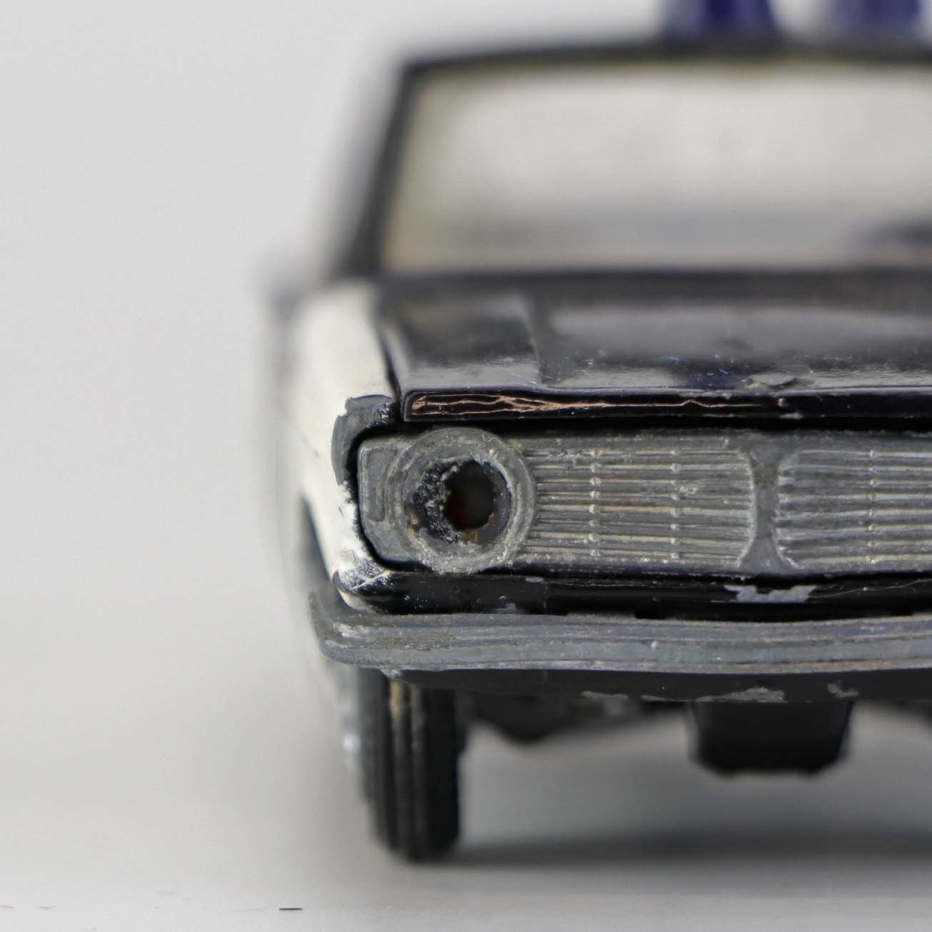 Politibil med to blinklys. Legetøjsbil i sortlakeret metal med gummi hjul og blå blinklys. Model Volvo 144
