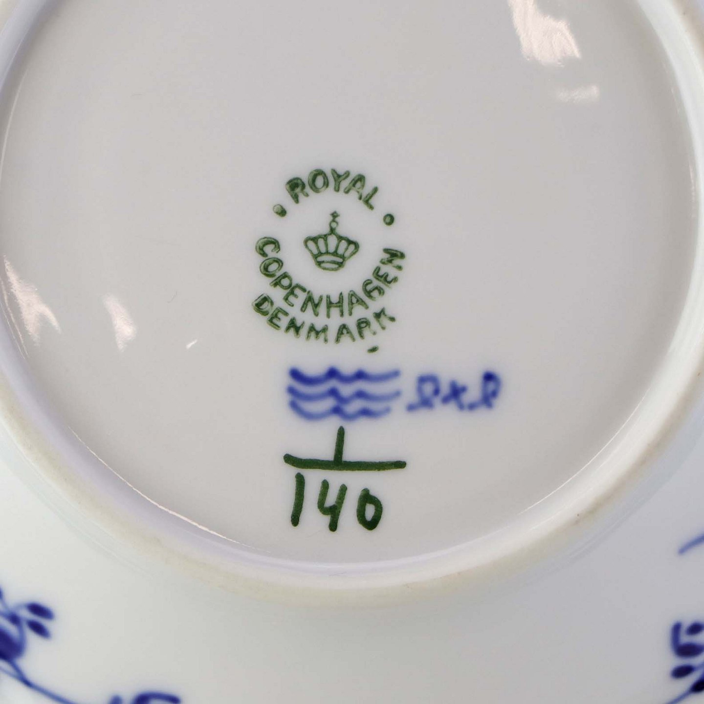 Musselmalet er af kongeligt hvidt porcelæn, dekoreret med rifler og mønster af blå ranker og blomster.