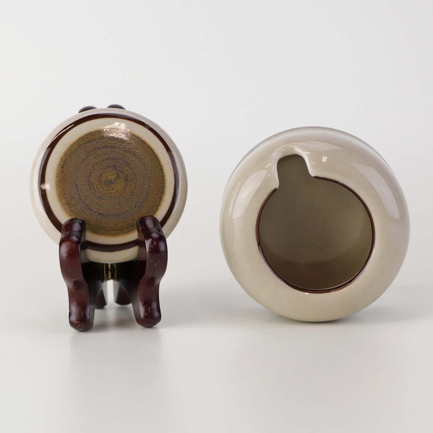 Stellet Peru er af stentøj, glaseret med lys sandfarve og dekoreret med bånd af grøn/brunlige farve