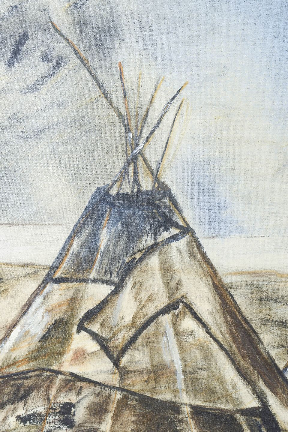 Modernistisk landskabsmotiv fra Lappland med samiske telte gengivet i en ekspressiv og let abstraheret form. Udført i dæmpede jordfarver med fri penselføring, signeret.