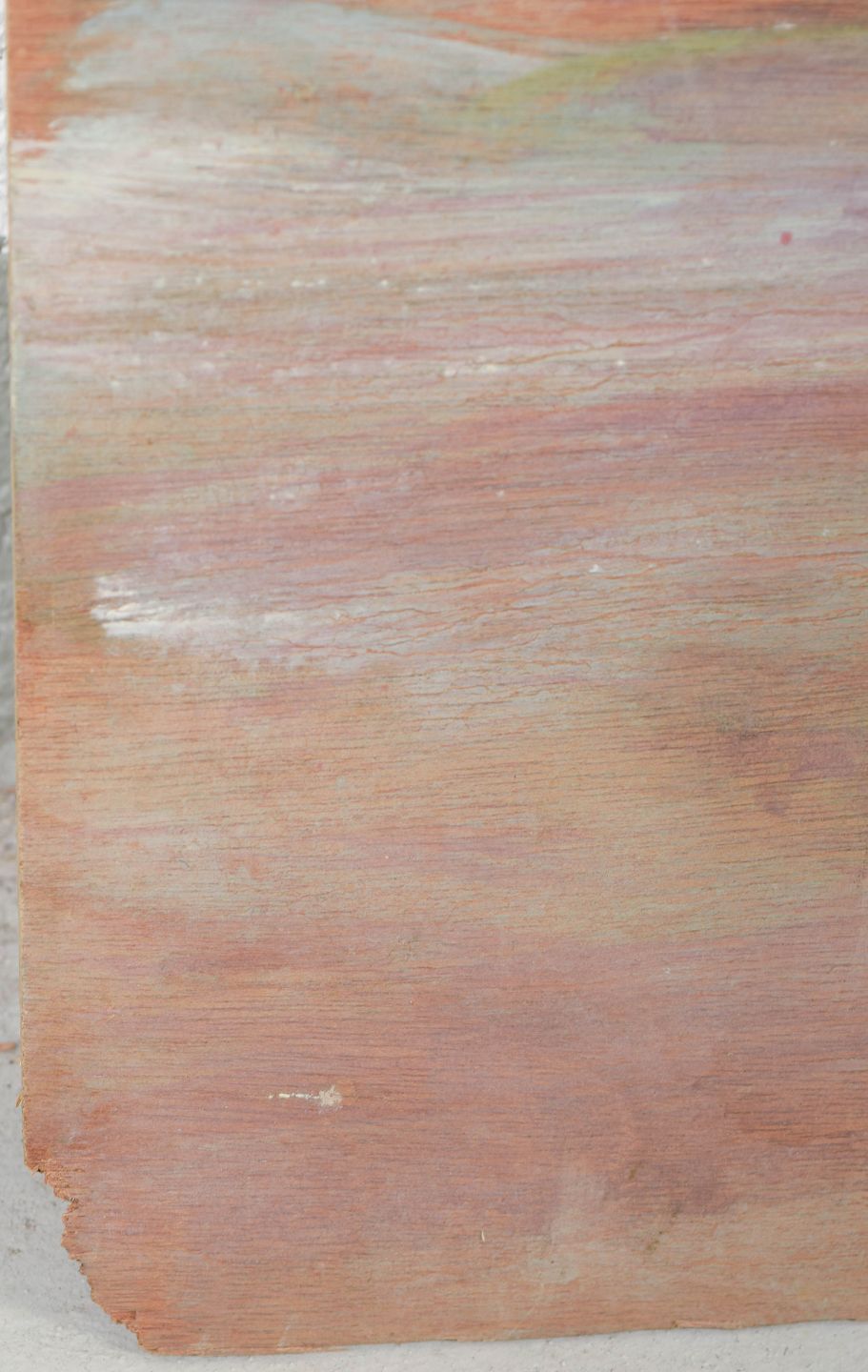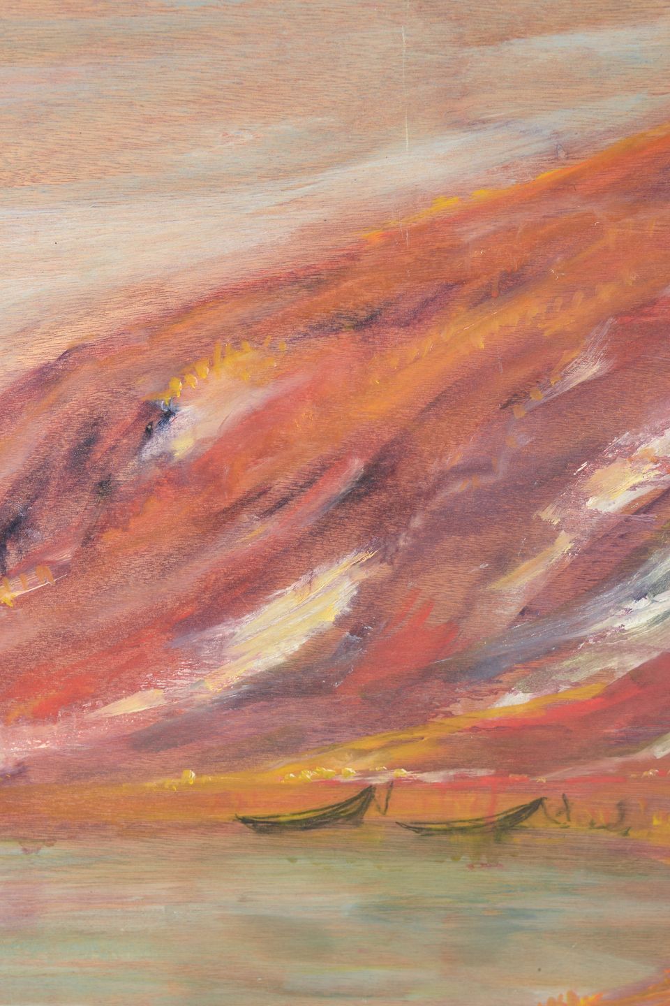 Modernistisk komposition med abstraheret landskabsmotiv i varme jordfarver og ekspressiv penselføring. Olie på træplade, signeret.