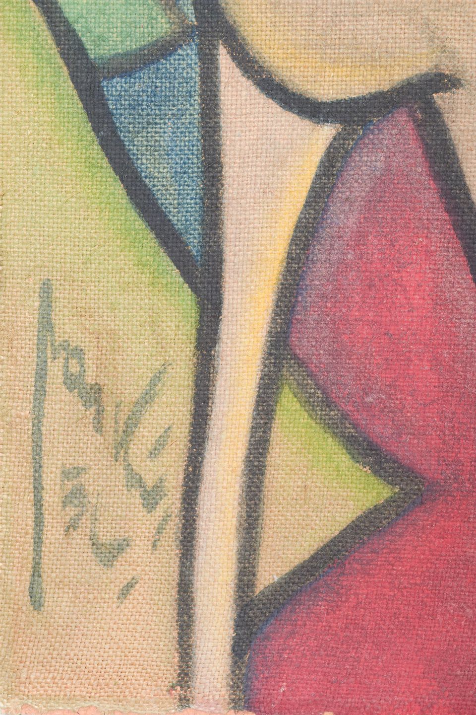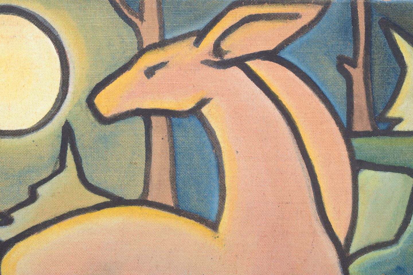 Abstrakt og stiliseret komposition med figurative elementer i form af hjortelignende motiver, udført i en modernistisk farveholdning med bløde overgange og dekorative konturer. Signeret og dateret 1956.