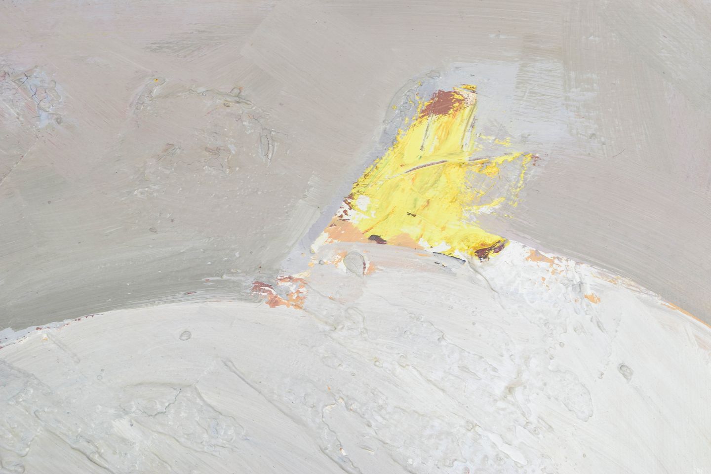 Abstrakt komposition udført i olie på plade med brede, organiske farvefelter og en afdæmpet, jordnær farvepalette. Kompositionen fremstår med en balanceret opbygning mellem mørke og lyse partier, typisk for midten af det 20. århundredes nordiske modernisme.