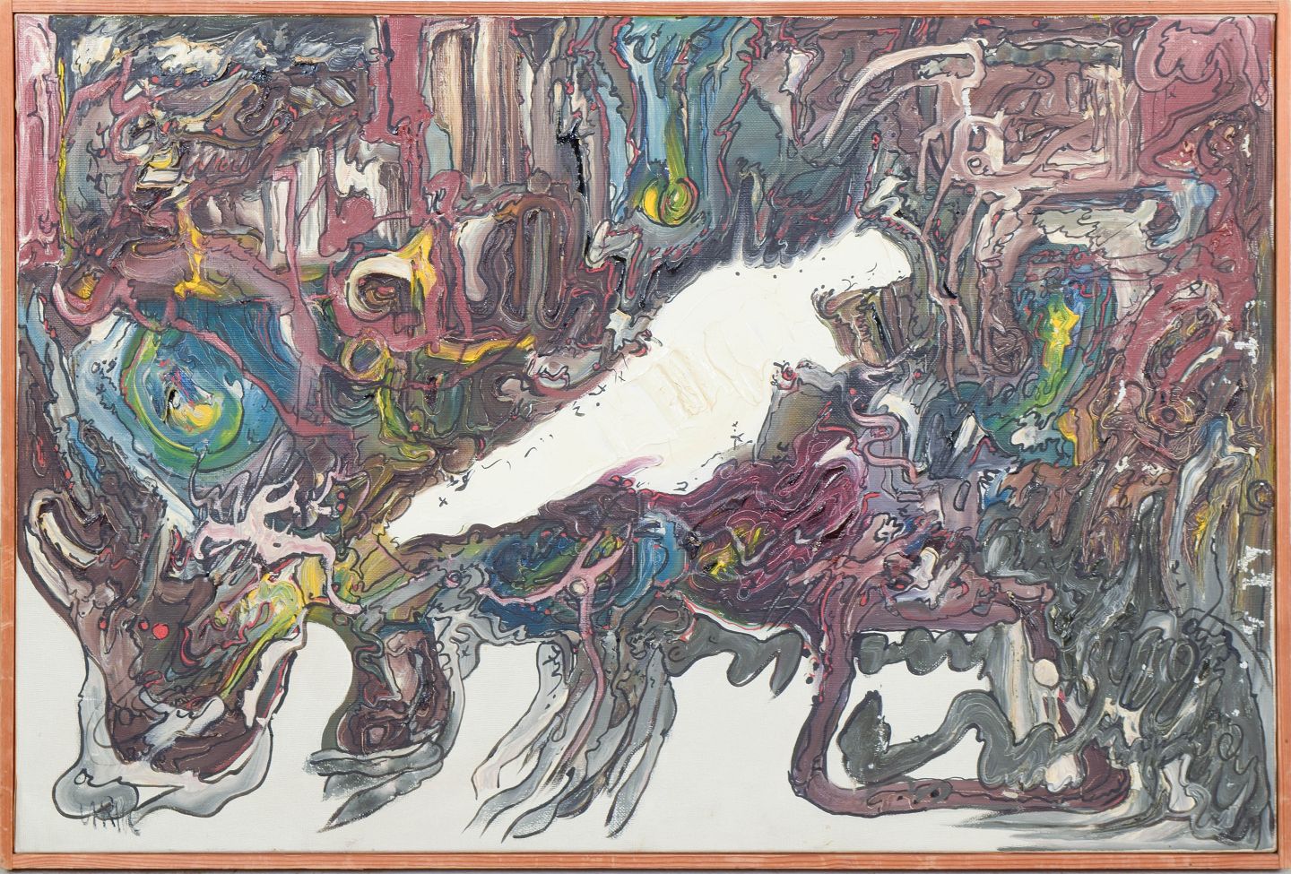 Abstrakt og ekspressivt komposition med organiske, næsten biomorfe former og komplekse lag af farve i dybe røde, blå og jordede toner. Dynamisk opbygning med flydende konturer og en intens, gestisk penselføring, signeret.