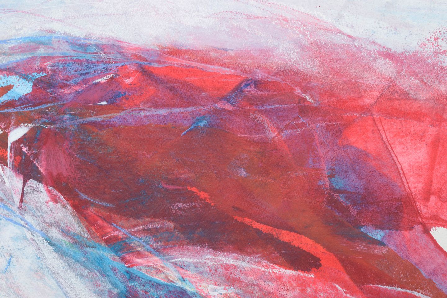 Abstrakt komposition med eksplosive farvefelter i røde, blå og lyse nuancer, udført i mixed media med dynamisk og gestisk udtryk. Signeret og dateret 1998. Udstillet ved Firenze Biennalen 1999.