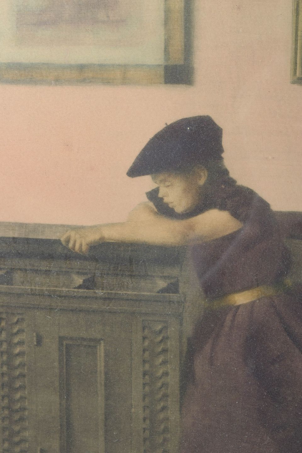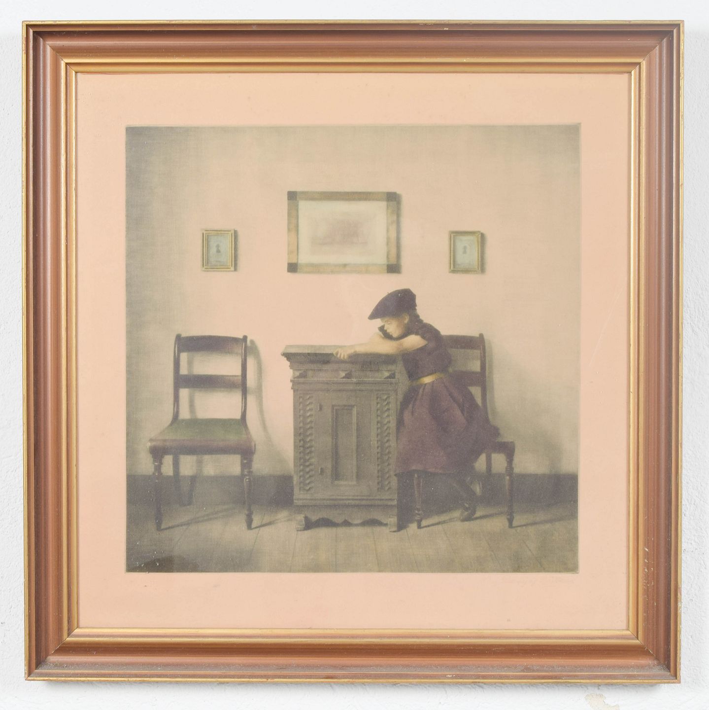 Stilfærdigt interiørmotiv med en ung pige ved et lille møbel, udført som original radering på papir. Kompositionen er præget af ro, afdæmpede farver og en intim stemning, karakteristisk for Ilsteds arbejde med lys, rum og hverdagsmotiver i hjemlige omgivelser.