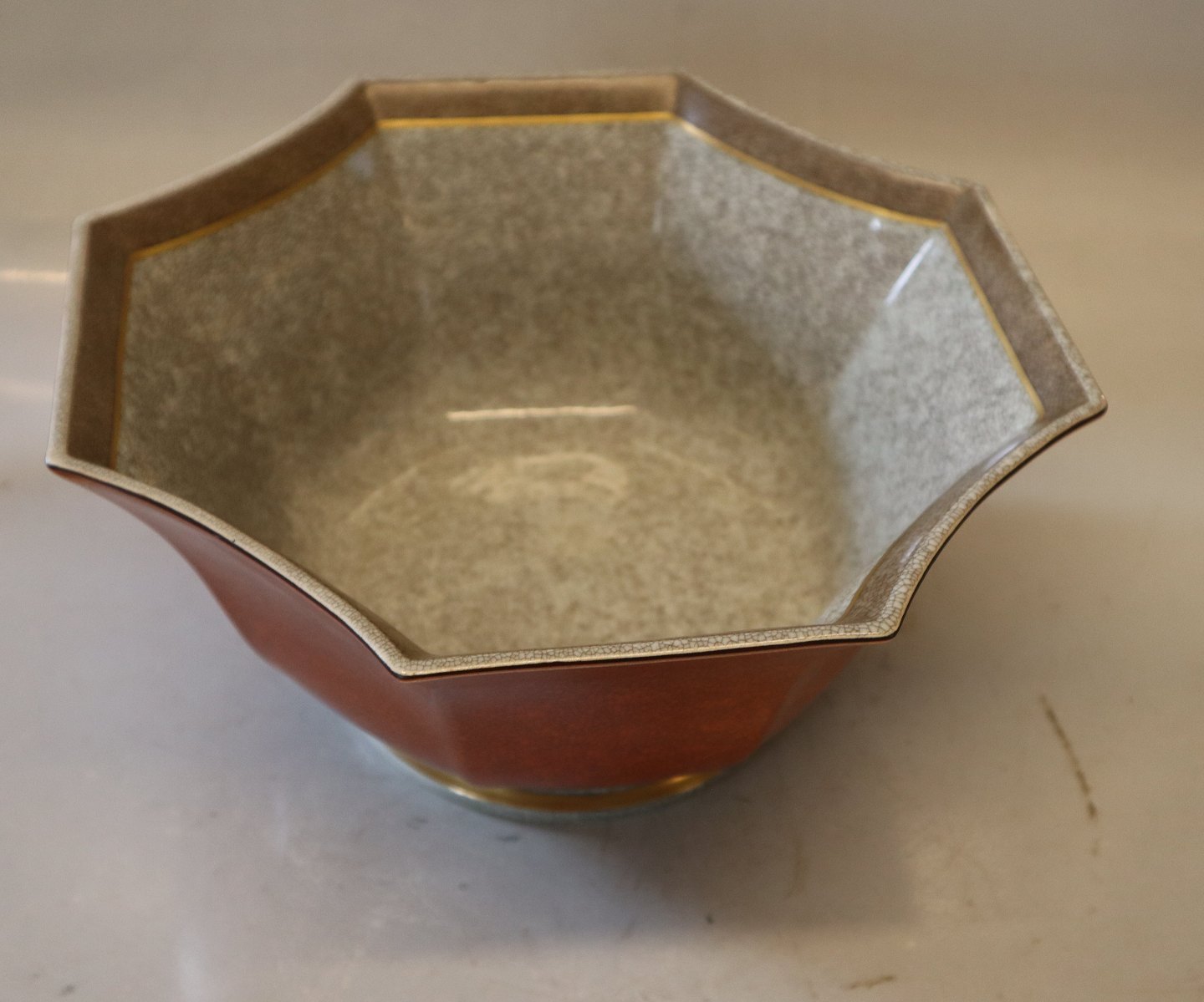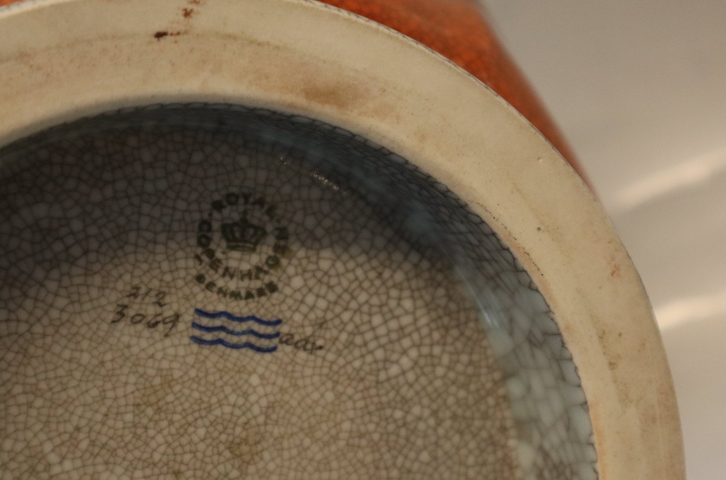 212-3069 Kgl. Orange skål med gråt og guld 13 x 28 cm Craquelé fra Royal Copenhagen I hel og fin stand