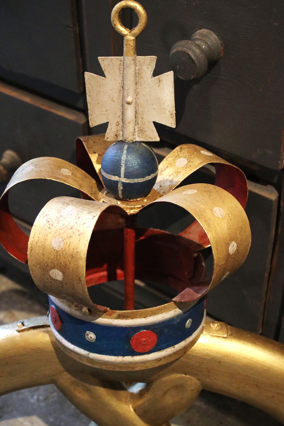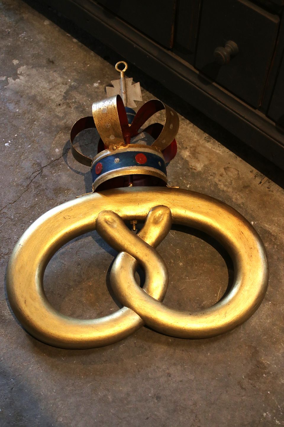 Gammelt bagerskilt udformet som en bagerkringle , forgyldt med metal krone...