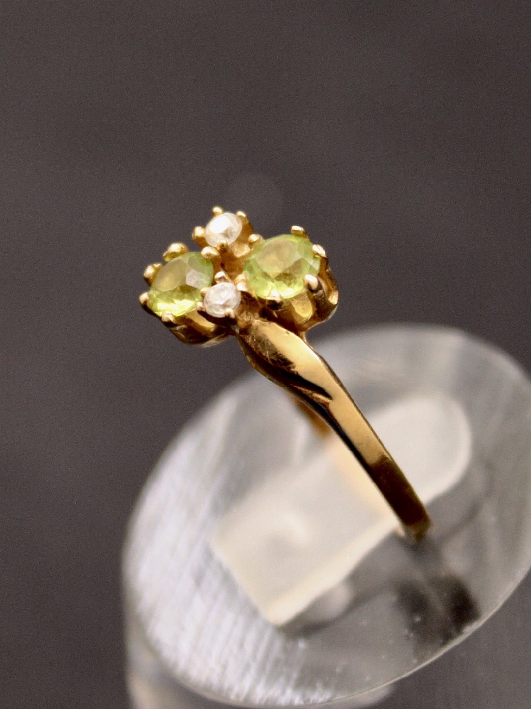 14 karat guld ring med 2 klare og to lysegrønne stene
