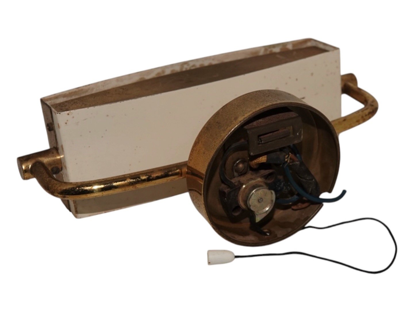 Lille messing væglampe med snoretræk fra ca. 1950