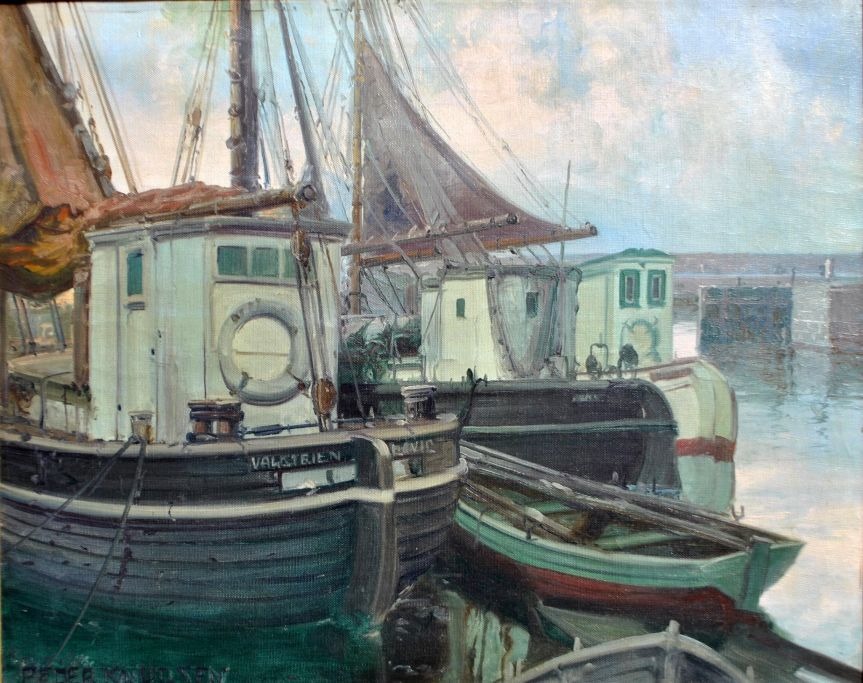 Knudsen, Peder Jacob Marius (1868 - 1944) Danmark: Fiskekuttere i en havn.