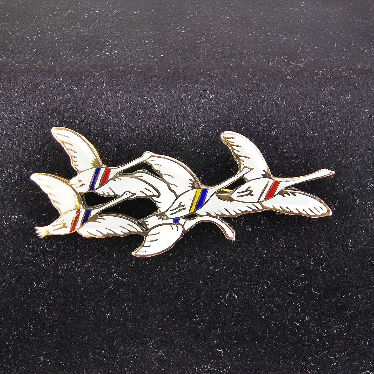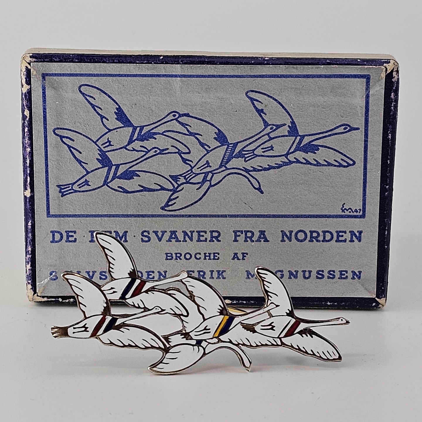 Broche i sterling sølv og emalje med motiv af fem svaner dekoreret med farver for de fem nordiske lande
