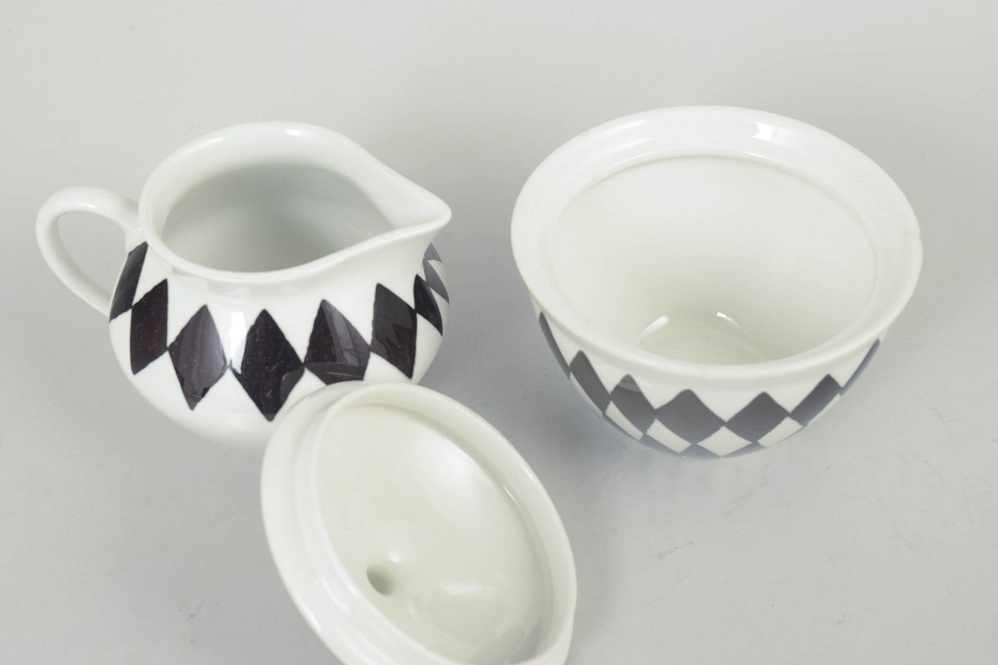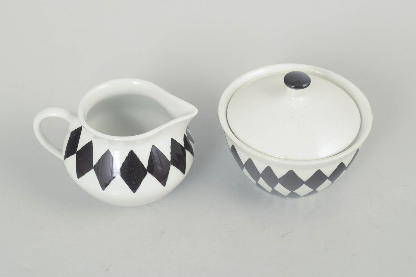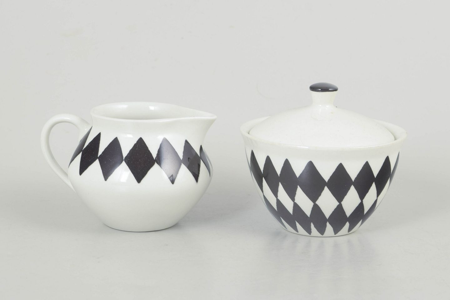 Sæt bestående af sukkerskål med låg og flødekande i porcelæn med karakteristisk sort rudemønster, udført i et enkelt og funktionelt formsprog fra perioden.
