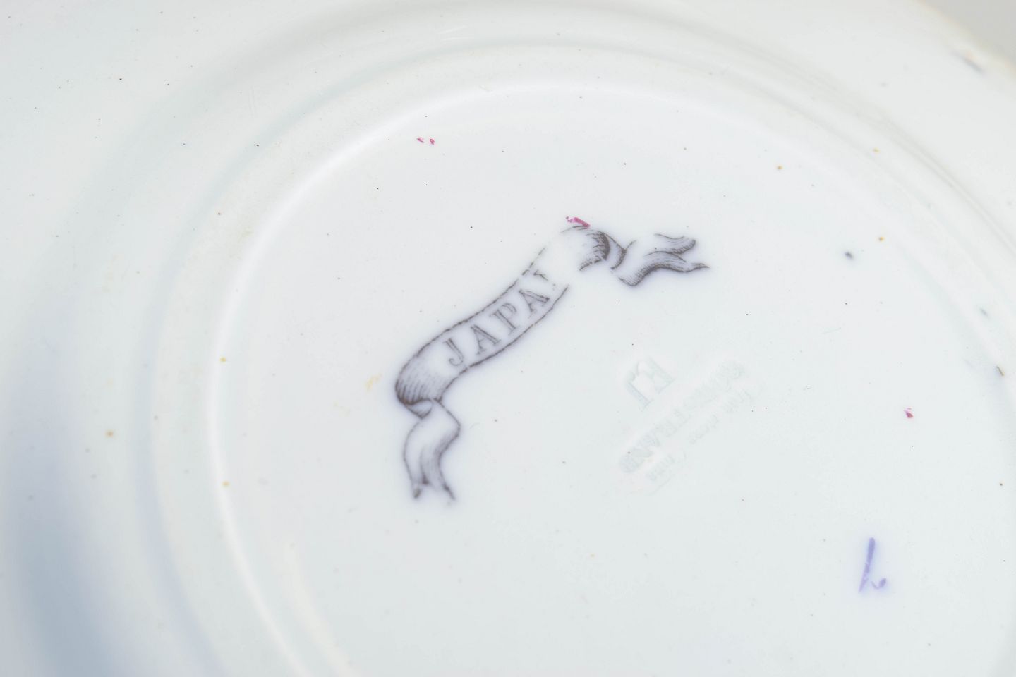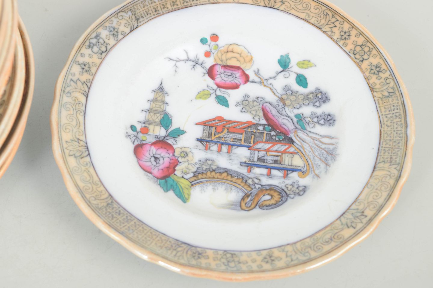 Dekorative små tallerkener i fajance med polykrom dekoration i orientalistisk japansk stil med pagodemotiv, bygninger, fugl og blomster. Model Japan, produceret i perioden 1866–1925 og dateret til 1880’erne.