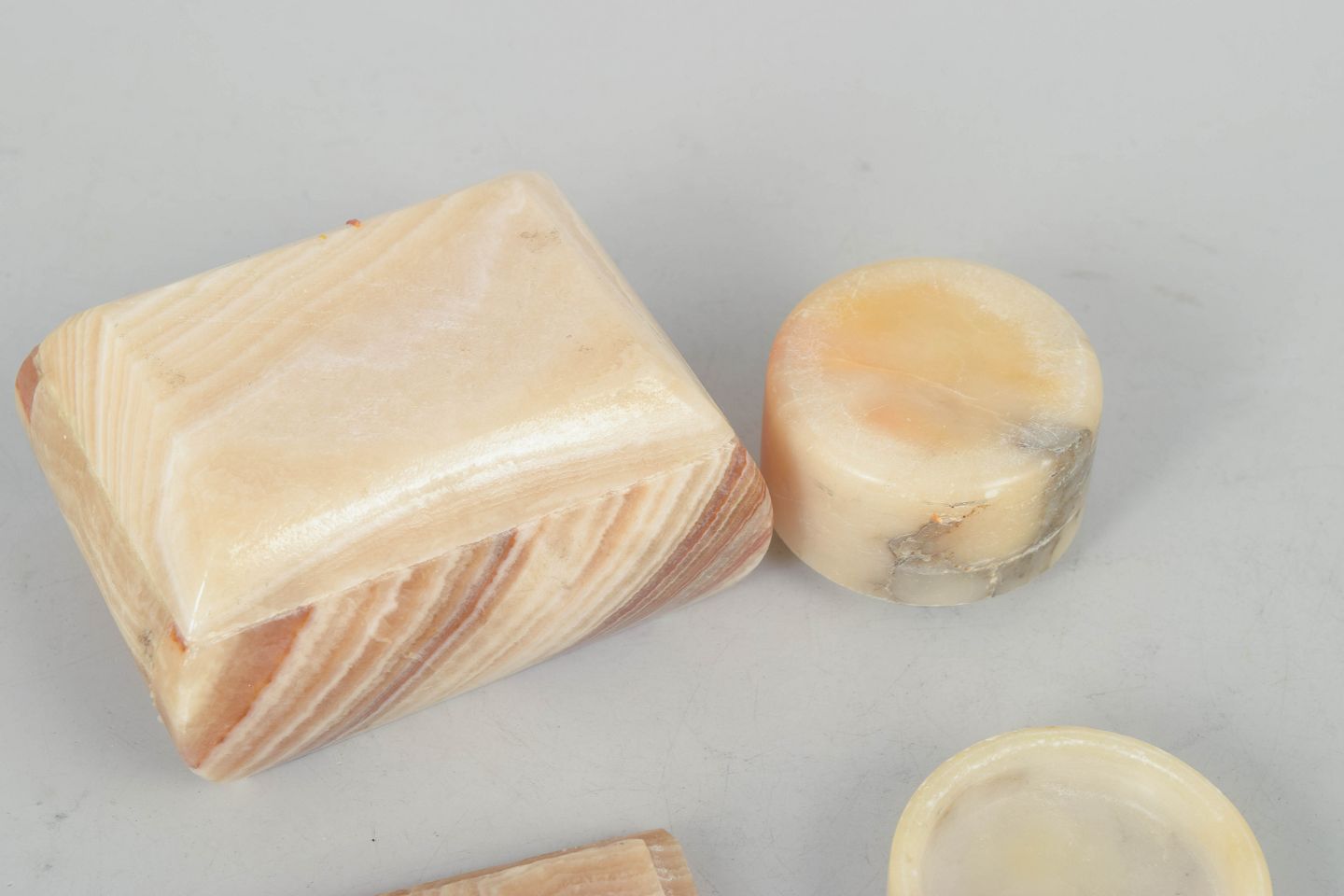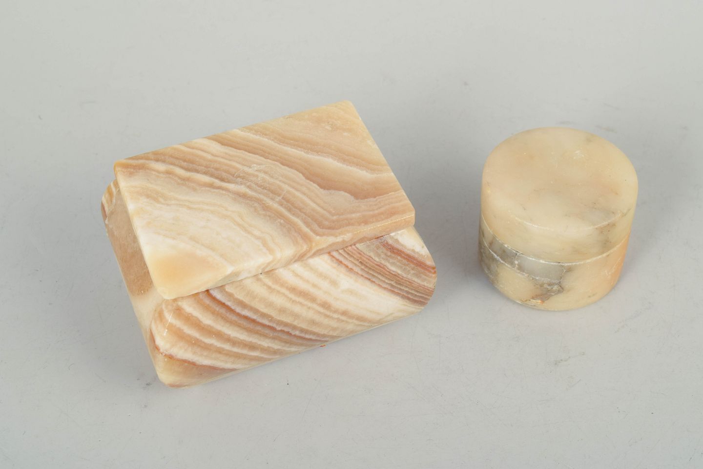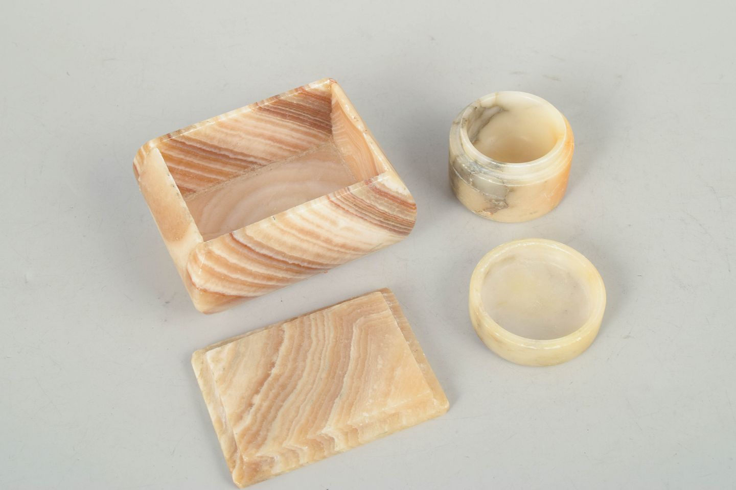 To dekorative æsker udført i poleret alabast med naturlig åretegning i varme beige og honningfarvede nuancer. Består af én kvadratisk æske med låg og én rund æske, begge med karakteristisk art deco formsprog.