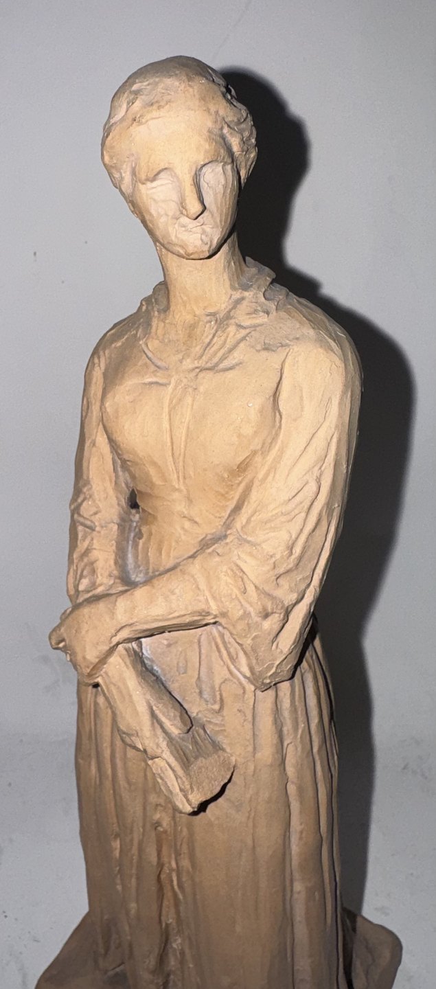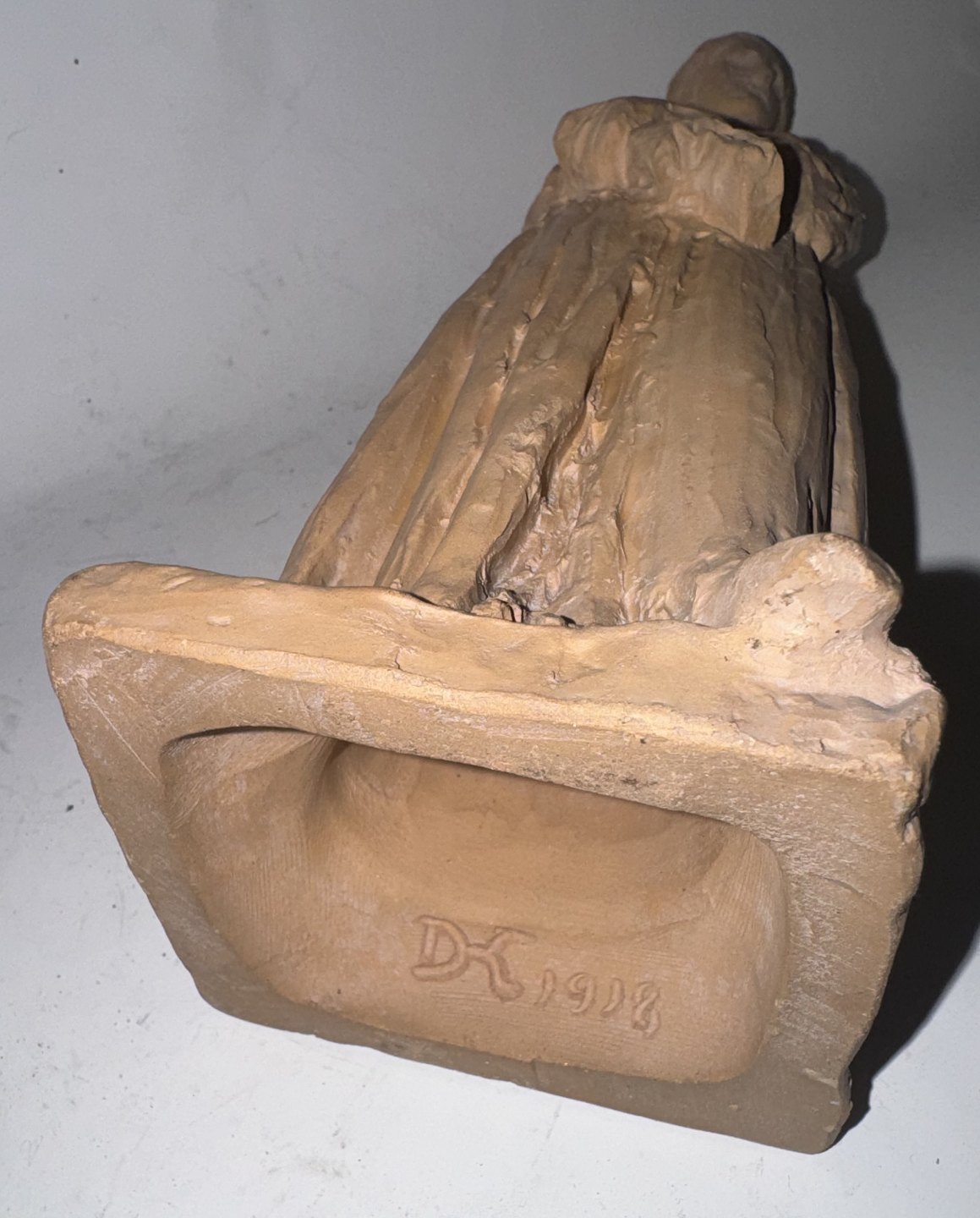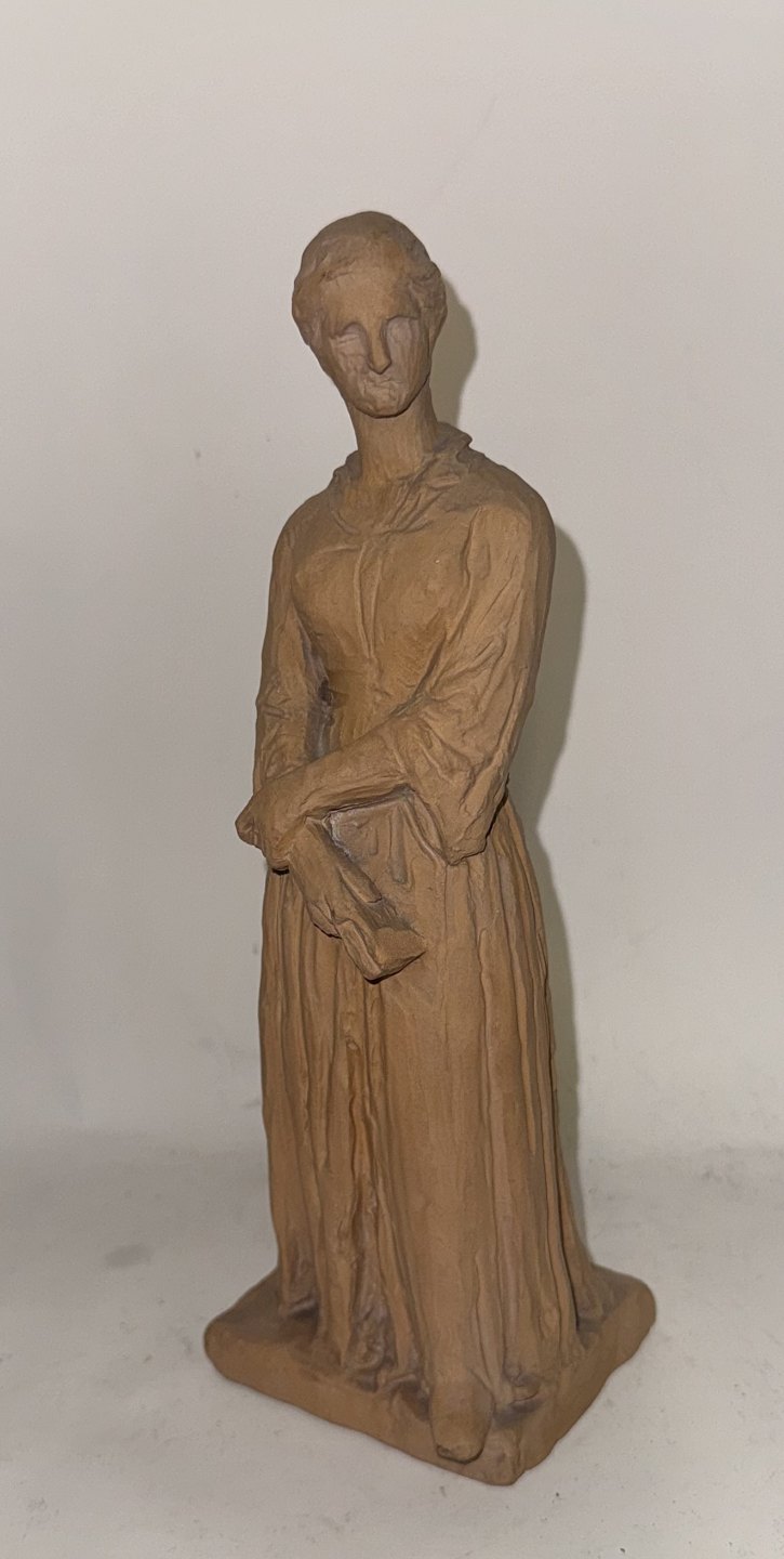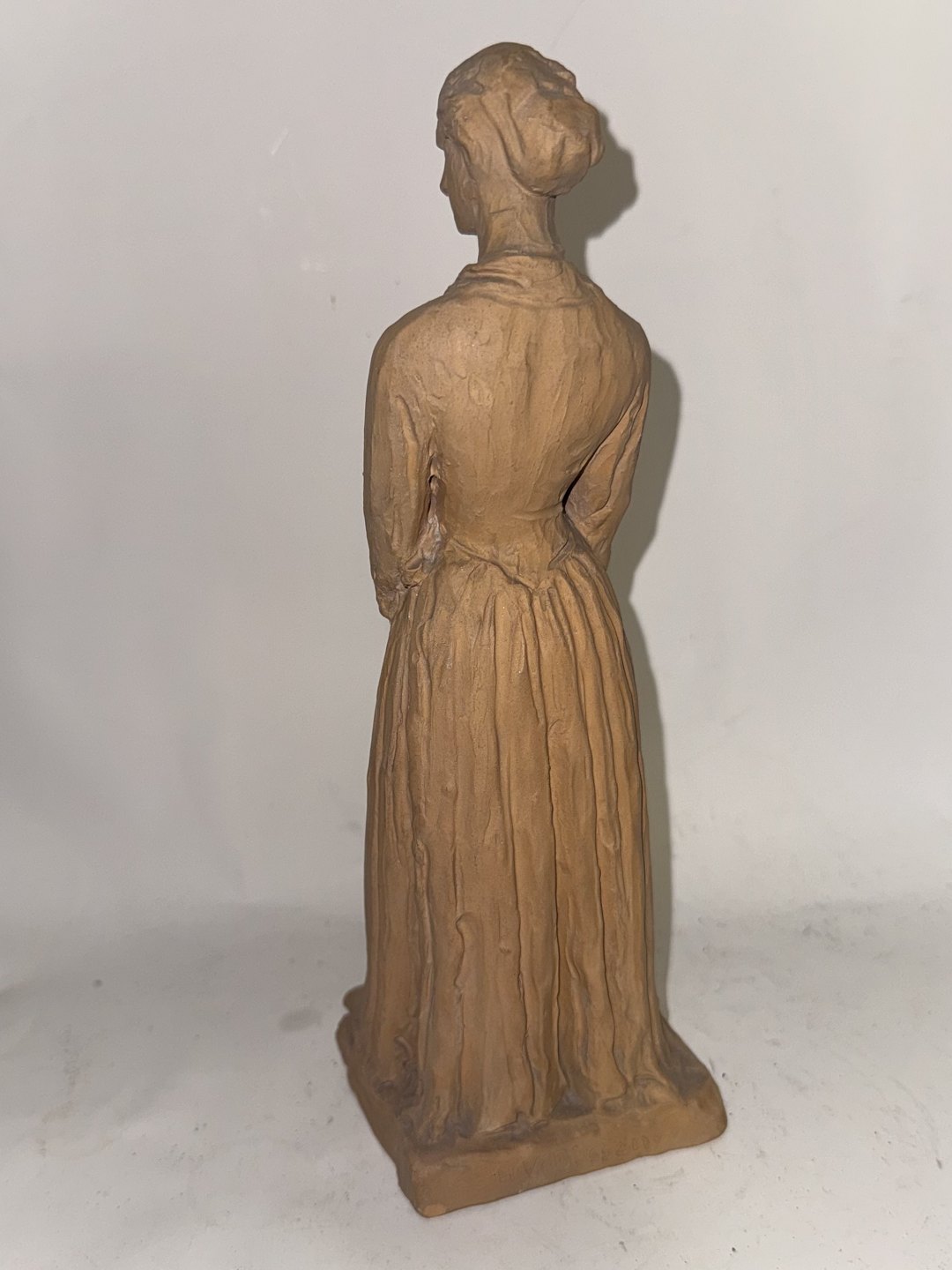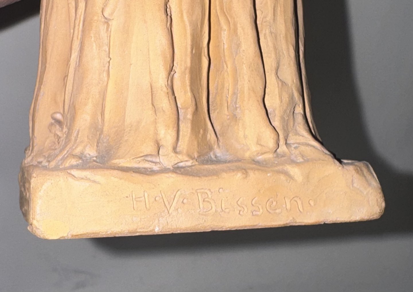 H. V. Bissen (1798-1868): Figur af stående kvinde. Udført i lertøj. Kunstnerens navn indridset på soklens bagside. Fremstår i god stand uden skader eller reparationer. Signeret med monogram samt 1918 indvendige ? Højde: 22,5 cm.