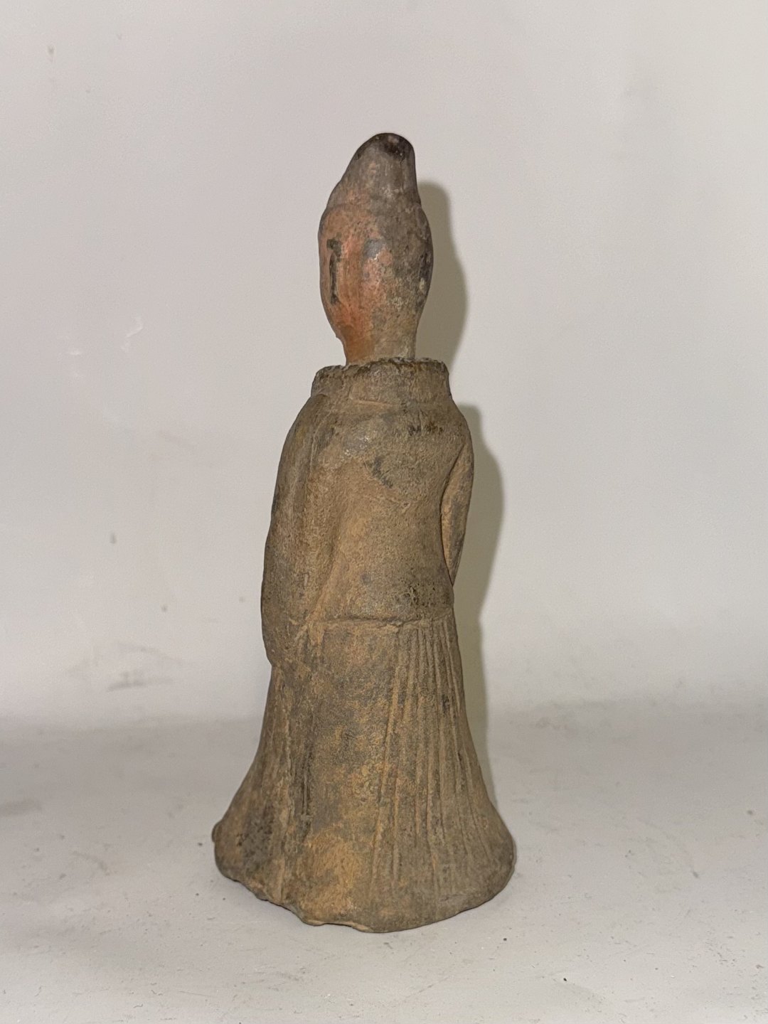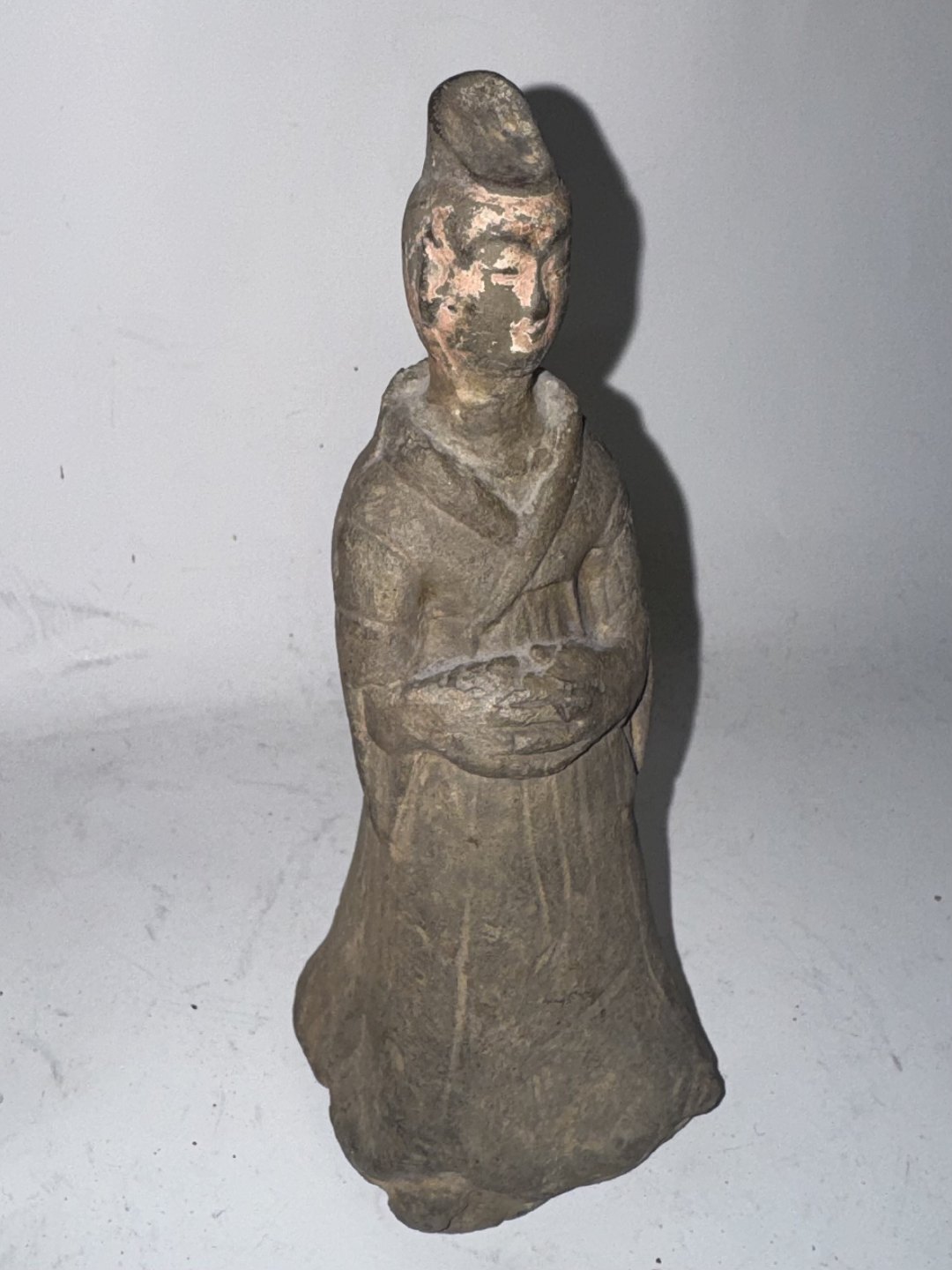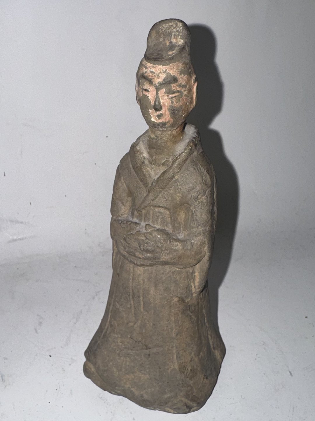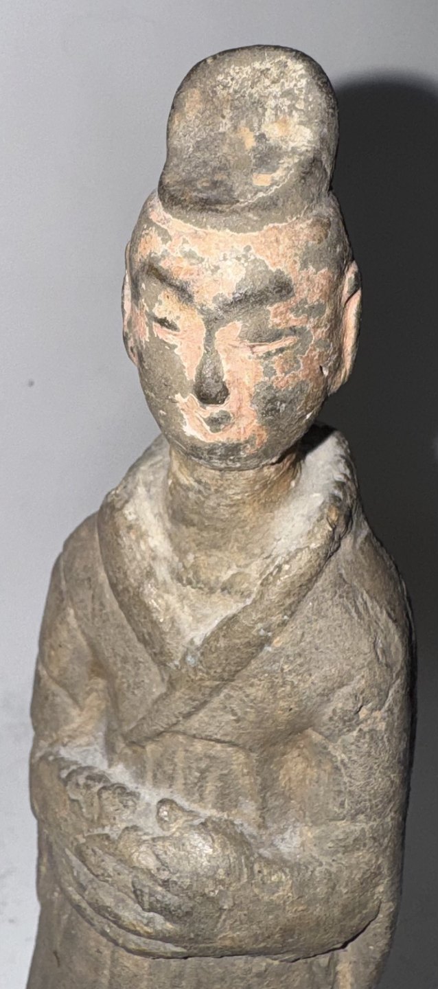 Hofdame eller tjenerinde: Kinesisk grav-figur i keramik fra Tang Dynastiet (618-907 e.kr.)Denne type figur blev lagt i graven med den afdøde. Figuren kunne eksempelvis symbolisere en tjener eller tjenerinde til efterlivet. Denne figur har sikkert været fuldt glaseret, men der ses blot rester af glasur i ansigtet. Ingen skader eller reparationer. H. 14,5 cm