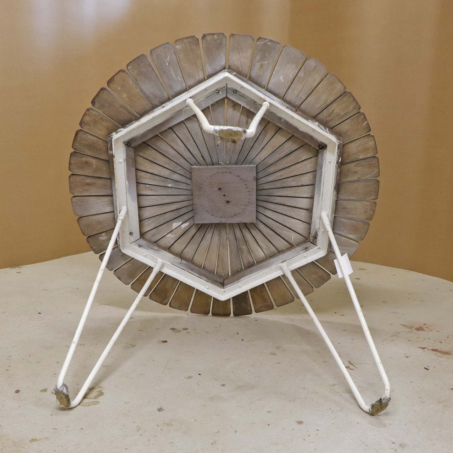 Rundt havebord fra år 1950-60 med nyrenoverede lameller i teaktræ med messingpynt på stel af hvidlakeret stålrør. Benene er ikke renoveret.
