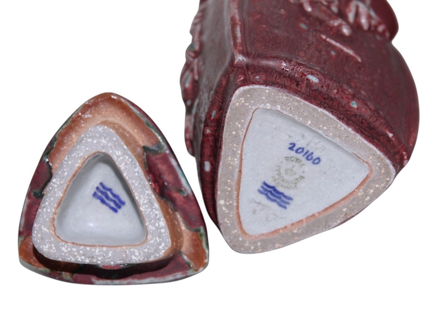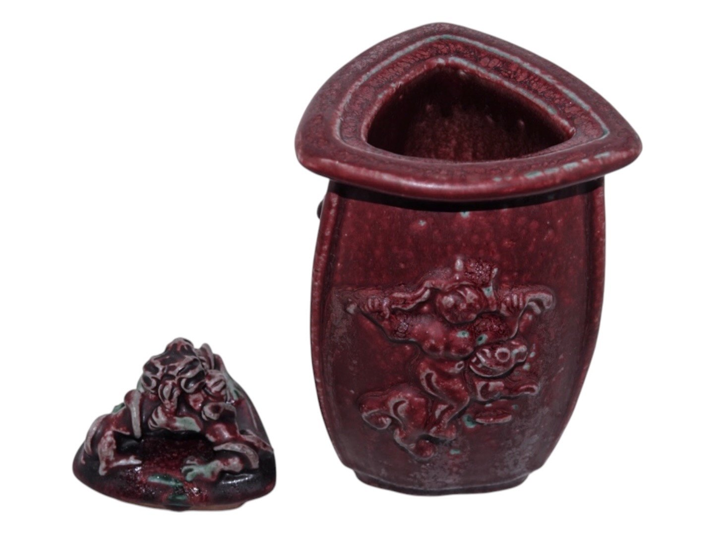 Royal Copenhagen keramik med rød okseblodsglasur, trekantet vase med låg udført og signeret af Bode Willumsen.