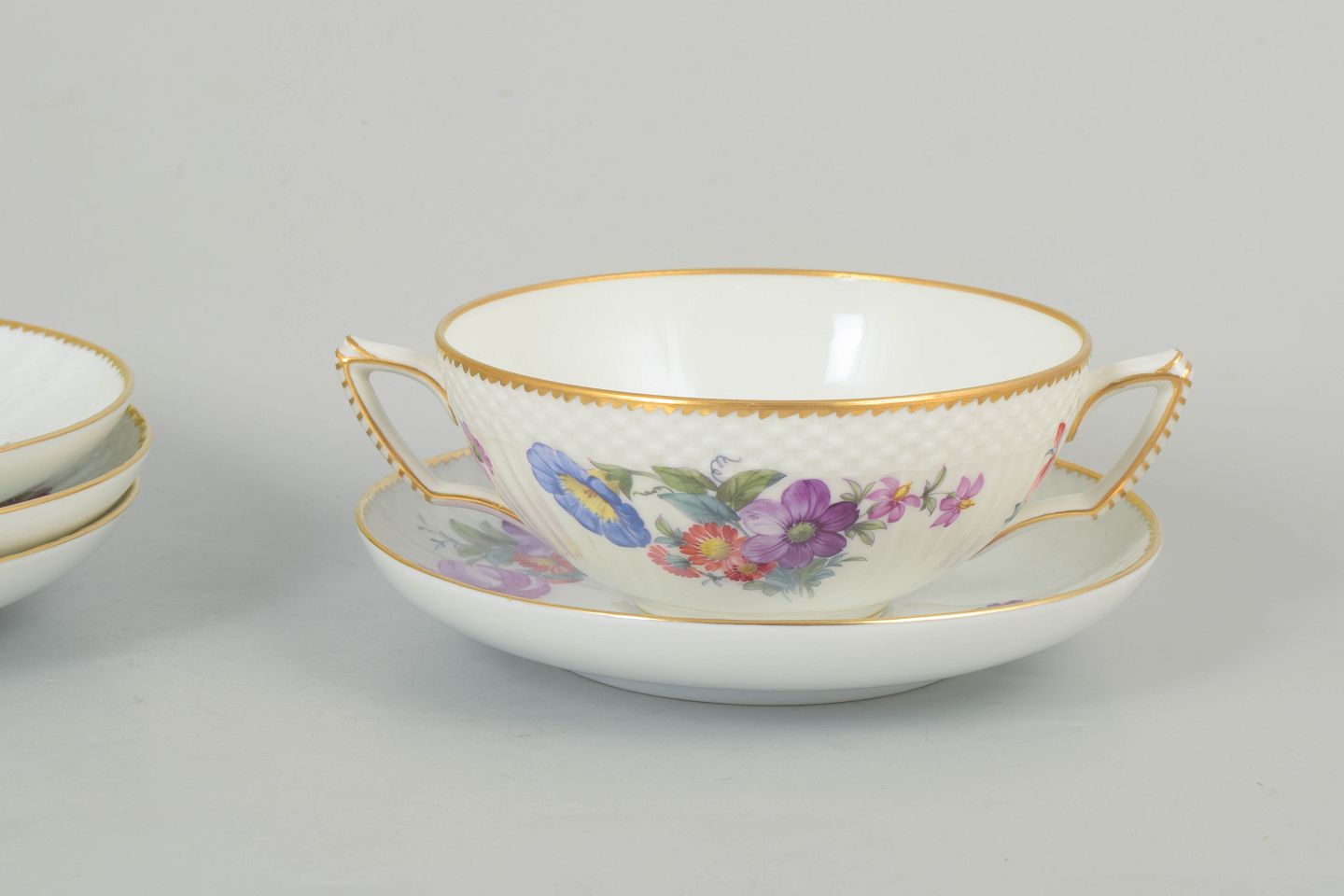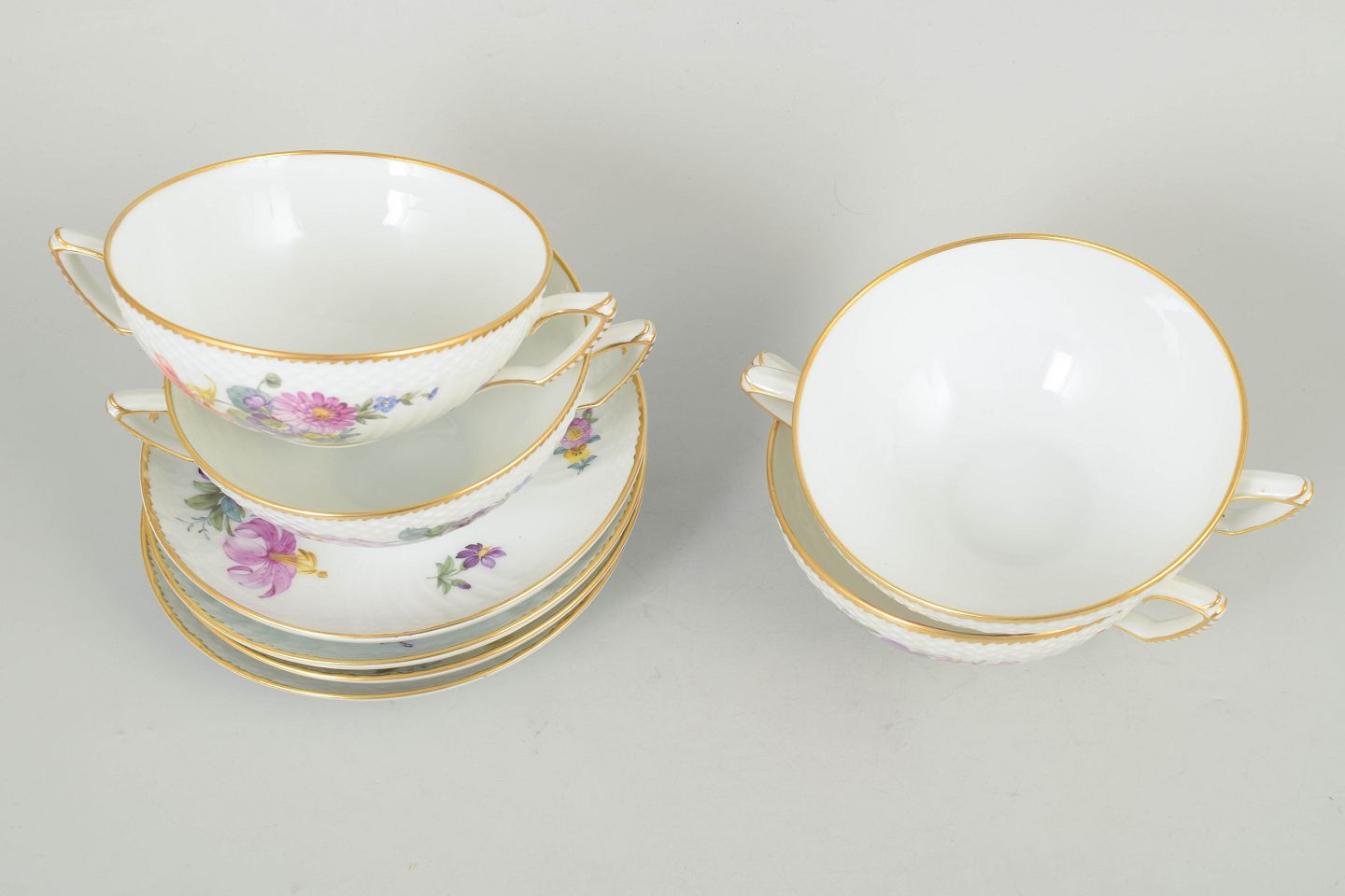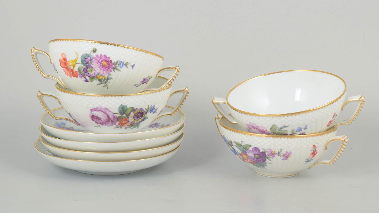 Sæt af fire bouillonkopper med tilhørende underkopper i porcelæn dekoreret med håndmalede blomster i saksisk blomst-mønster og afsluttet med forgyldt kant. Model 4/1872. 1. sortering.
